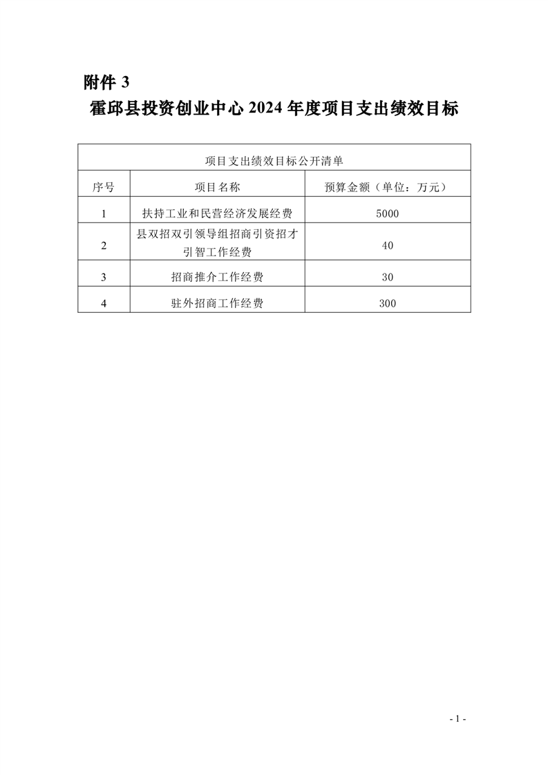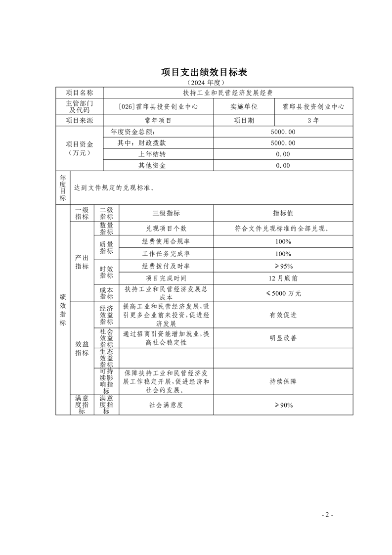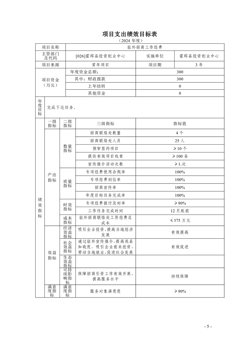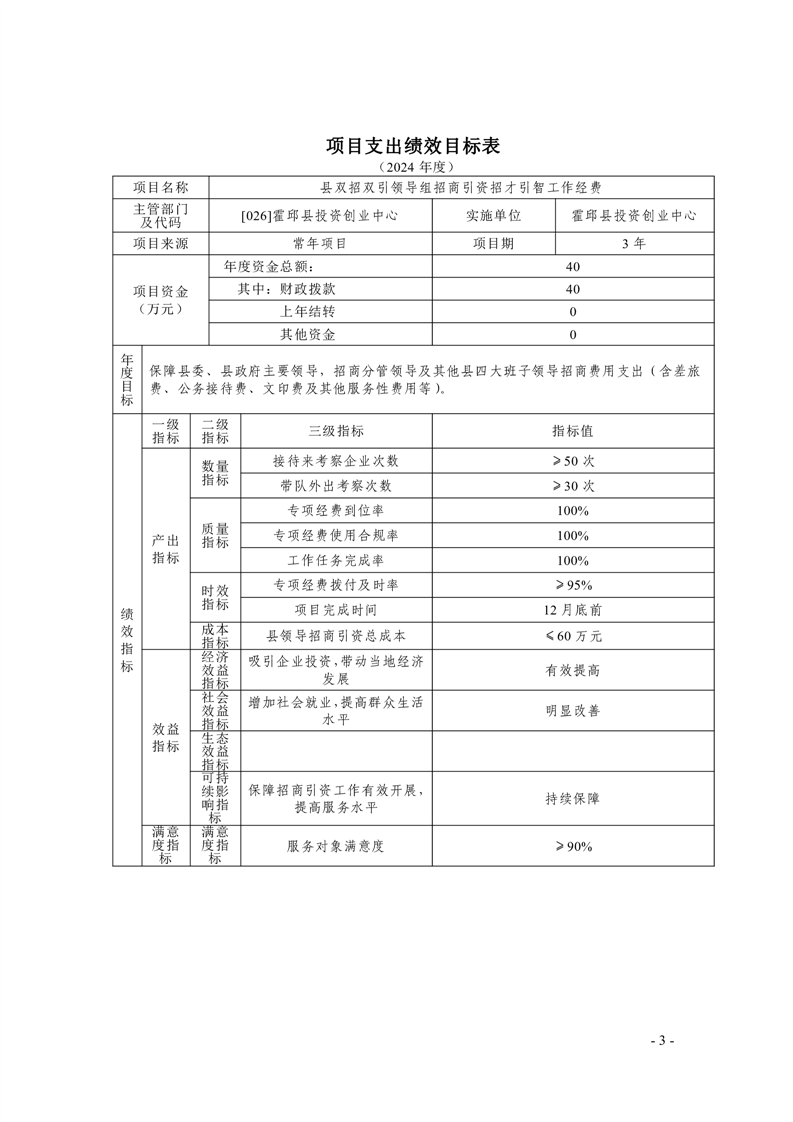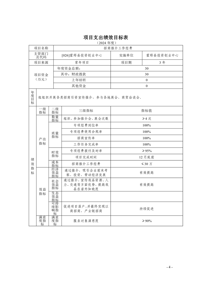 霍邱县投资创业中心2024年度项目支出绩效目标表