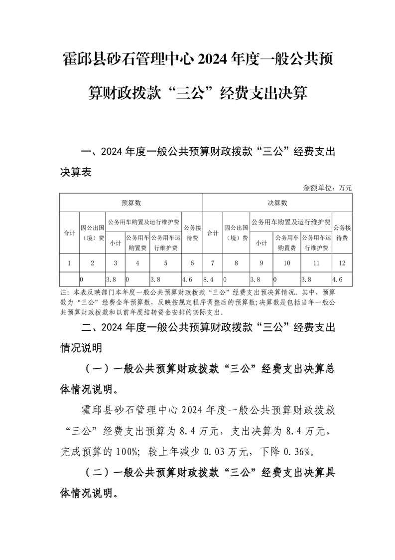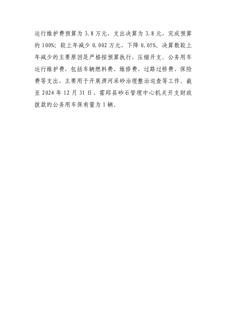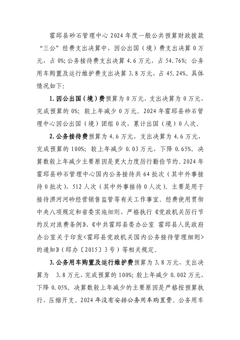 霍邱县砂石管理中心2024年度一般公共预算财政拨款“三公”经费支出决算