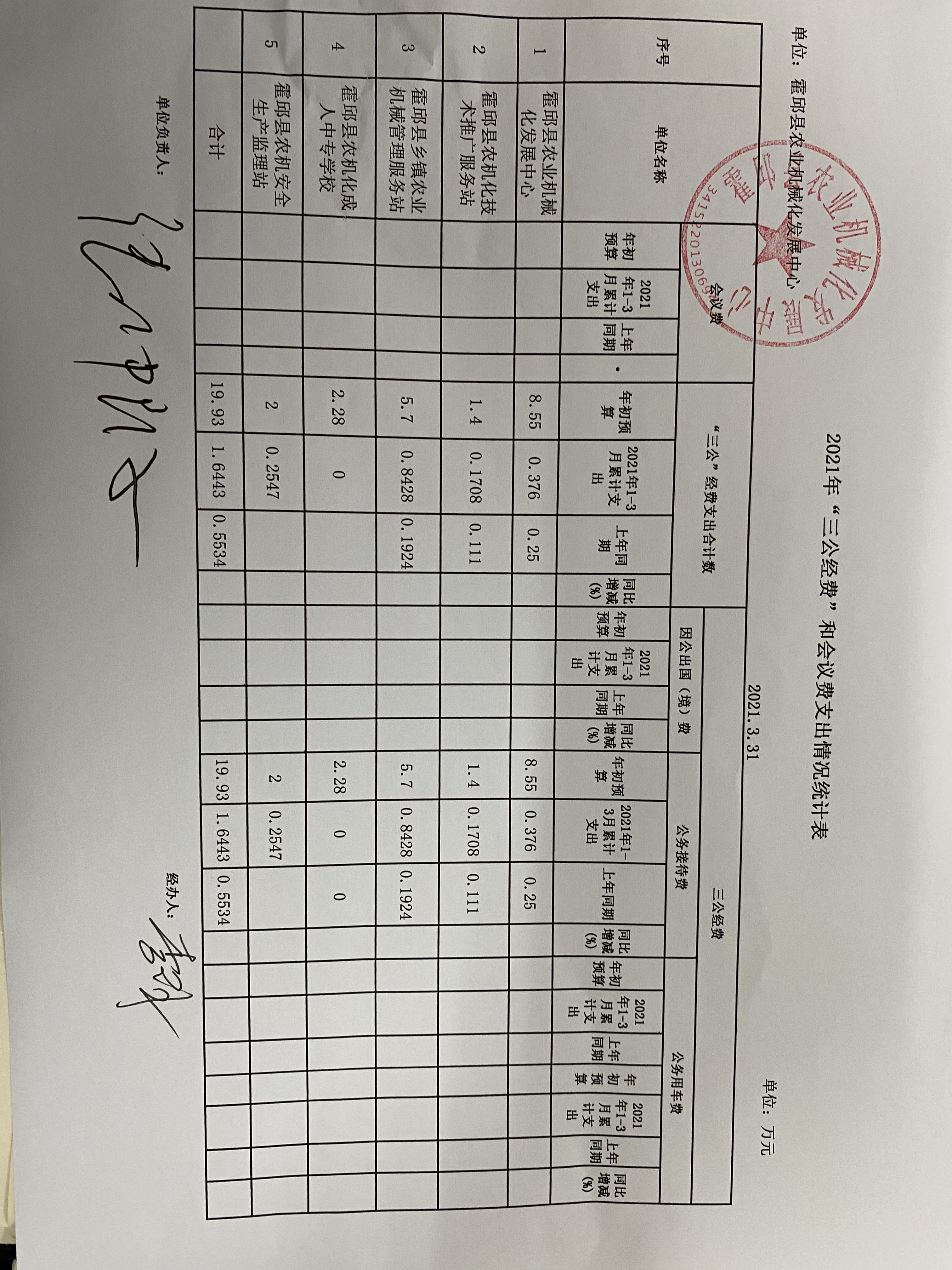 霍邱县农业机械化发展中心2021年1-3月份三公经费
