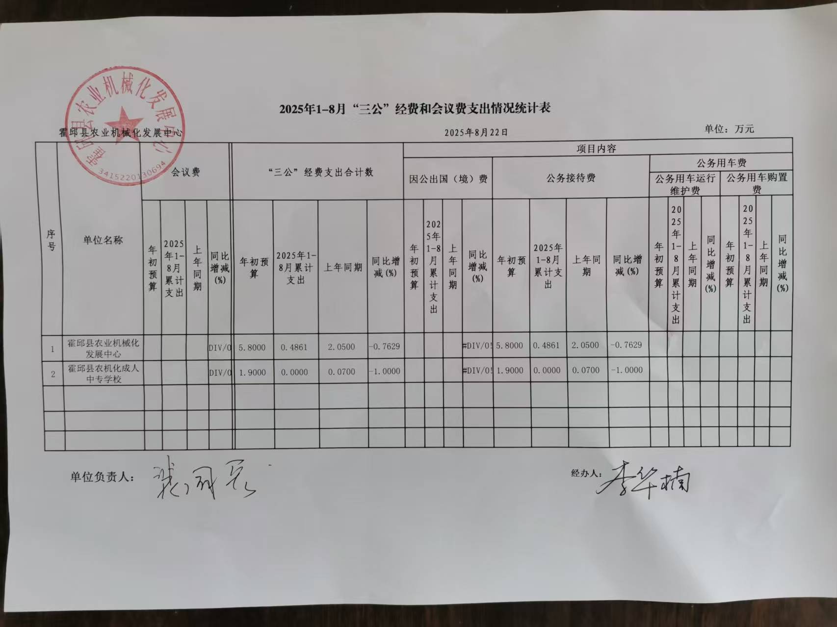 霍邱县农业机械化发展中心2025年1-8月“三公”经费