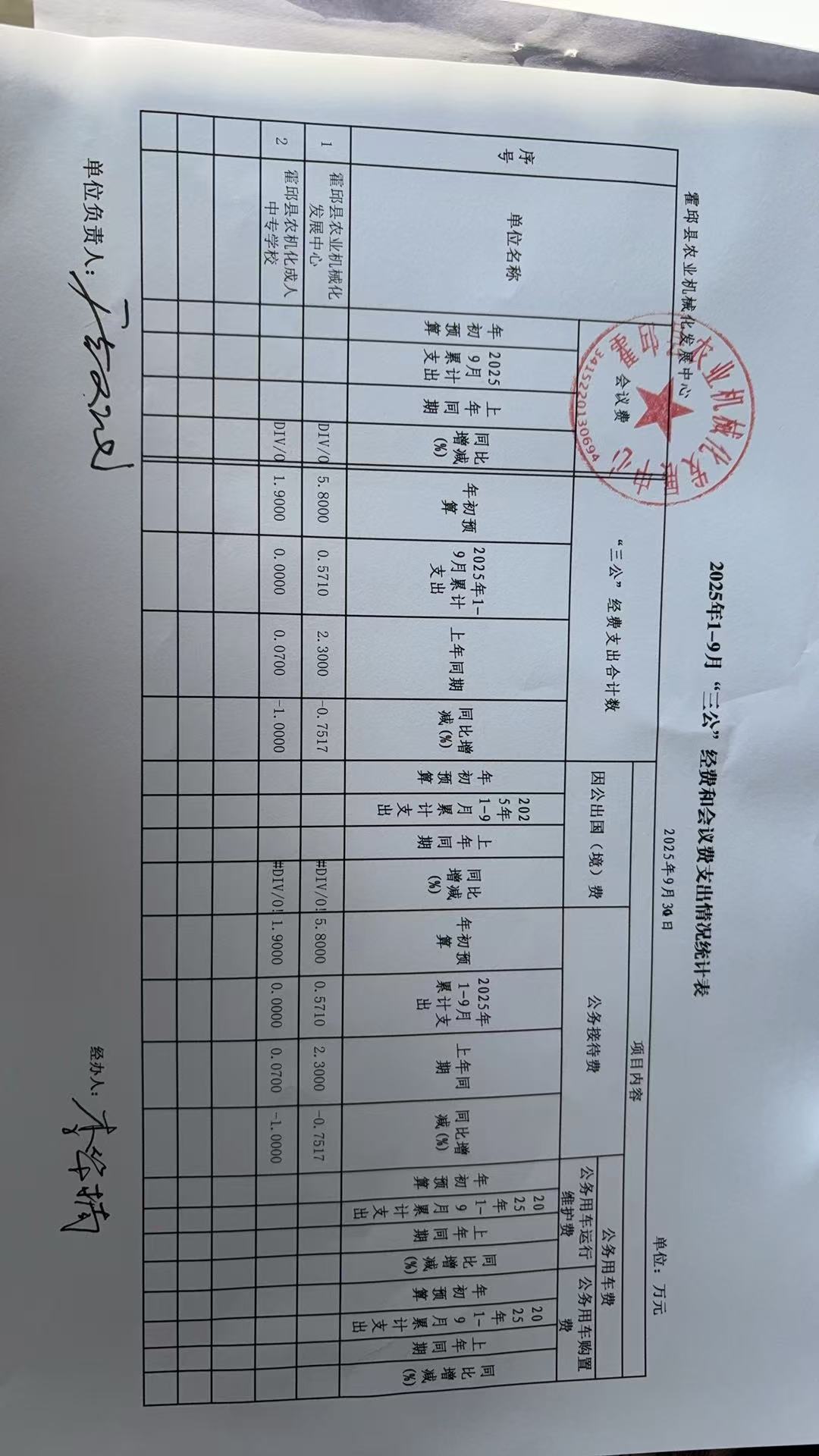 霍邱县农业机械化发展中心2025年1-9月“三公”经费