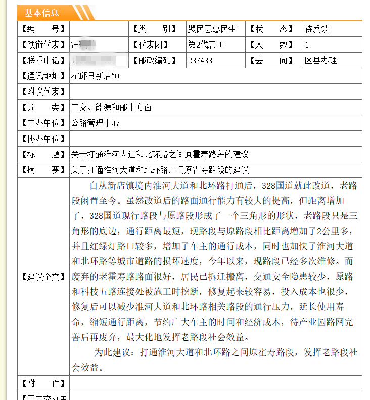 您好!您在县人大代表闭会期提出的“关于打通淮河大道和北环路之间原霍寿路段的建议”议案收悉,现就办理情况回复如下: