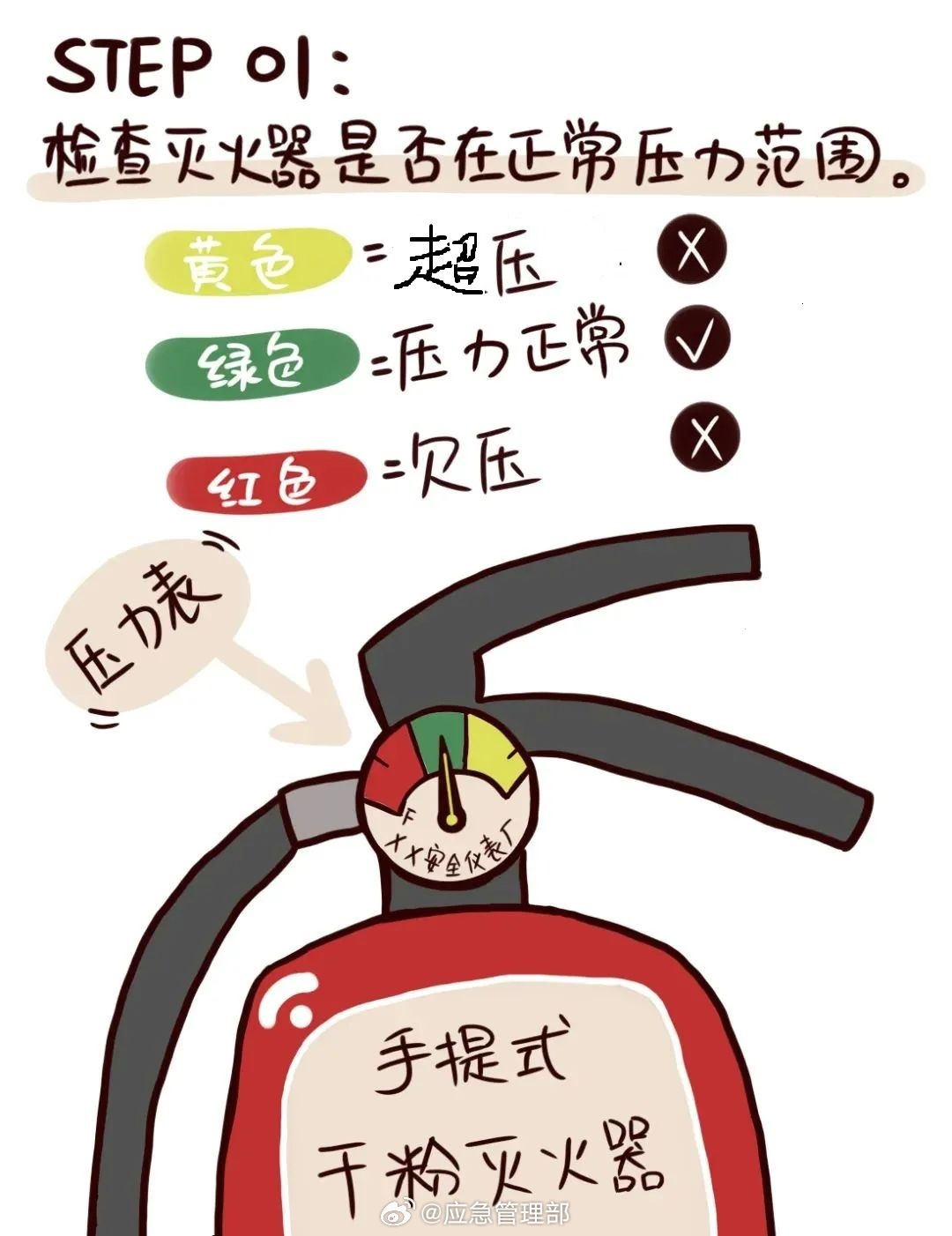 灭火器使用四字口诀——“提拔握压”可能对很多人来说耳熟能详,然而真正上手操作却不一定能会用。什么是保险销?要压下的把手是哪个?看图来学习一下↓