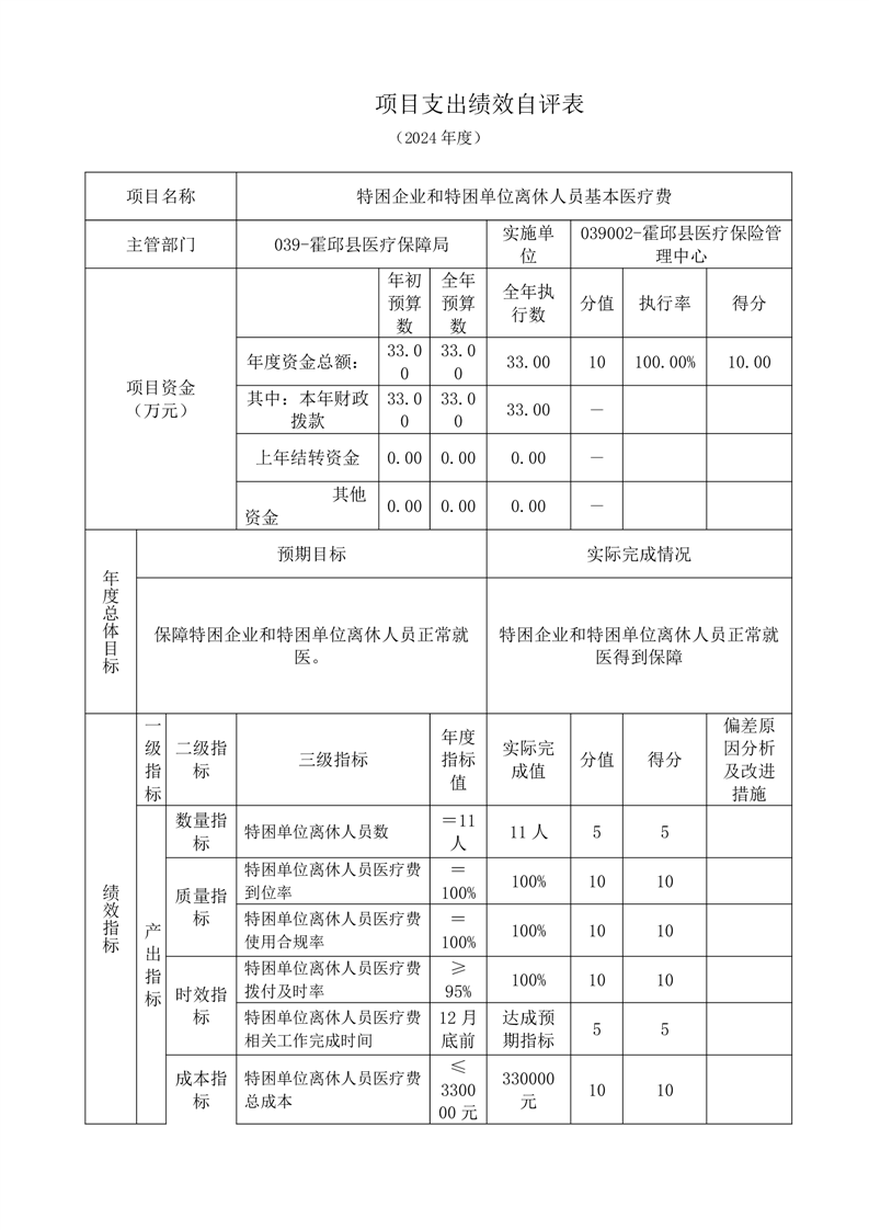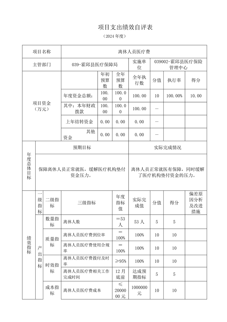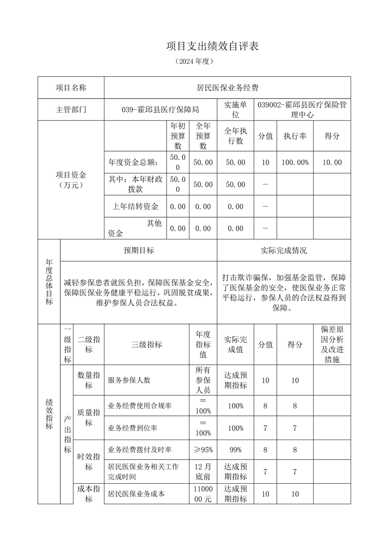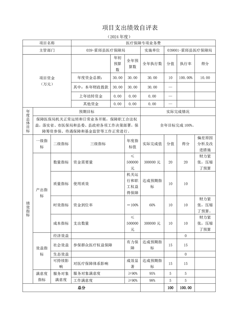 霍邱县医疗保障局2024年度项目支出绩效自评表