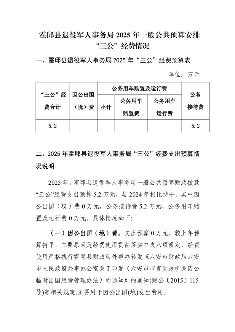 霍邱县退役军人事务局2025年度一般公共预算安排“三公”经费情况