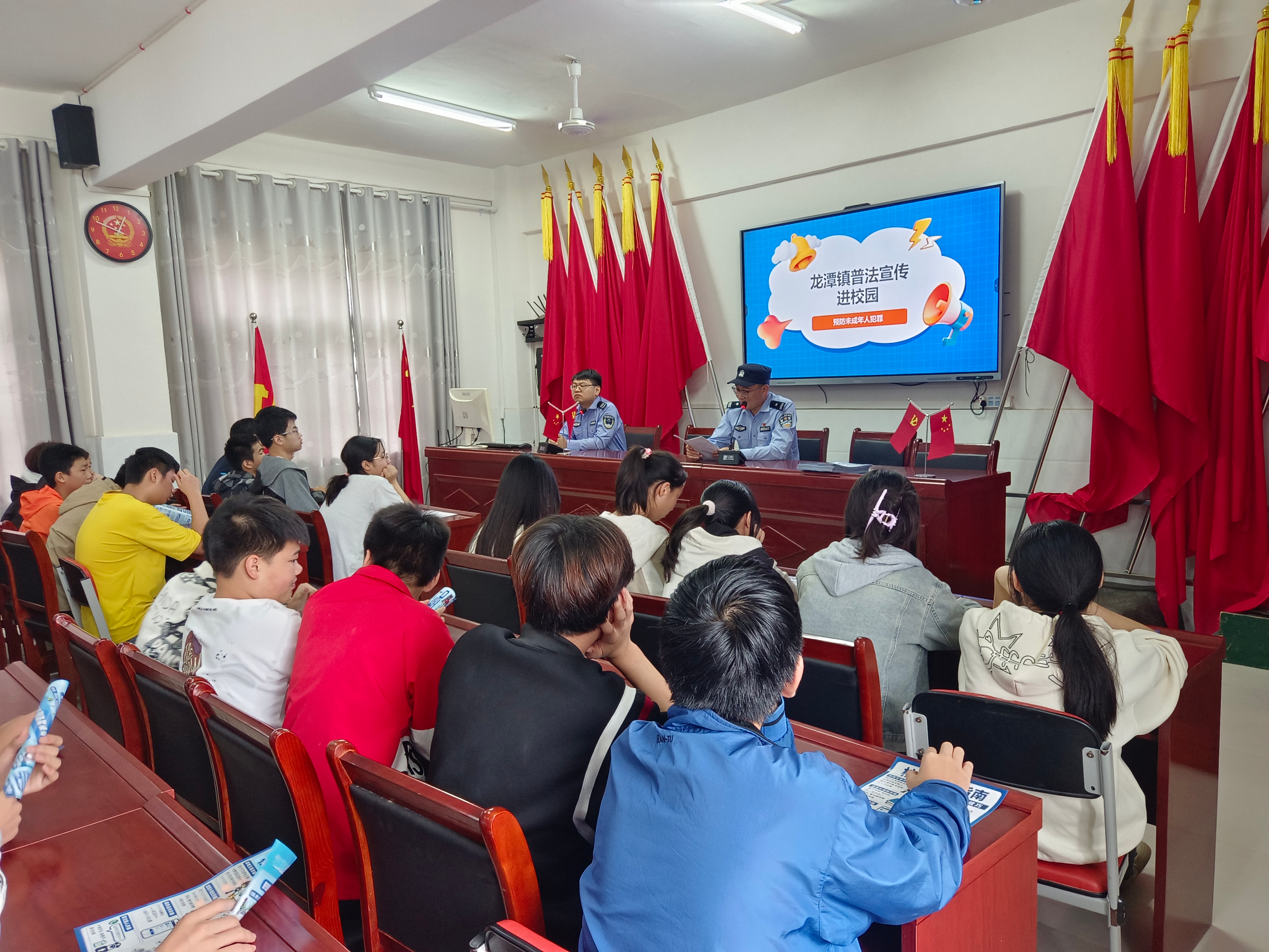 为进一步增强学生的法治观念和自我保护能力,促进青少年健康成长。2025年9月26日,龙潭司法所、龙潭镇派出所联合开展普法宣传进校园活动,为石庙学校的学生上了一堂生动精彩的法治教育课。