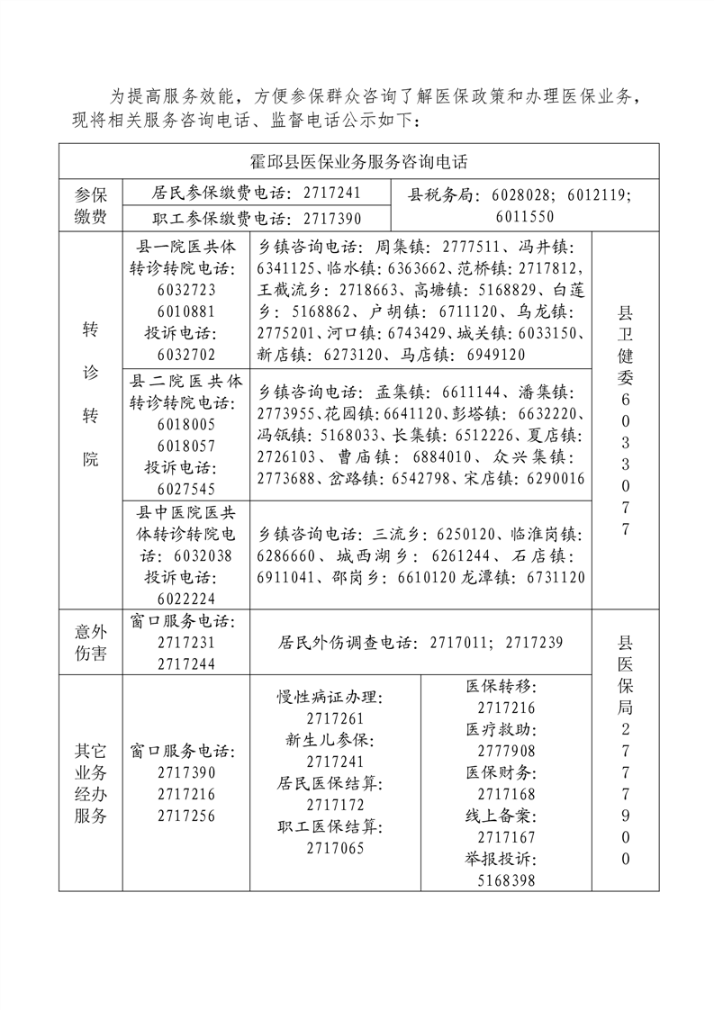 【主动回应】霍邱县医疗保障业务经办服务电话公示