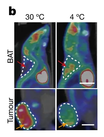 研究利用PET-CT显示小鼠体内葡萄糖的去向,可以看到在4℃的环境下,葡萄糖大量聚集在小鼠棕色脂肪区域,而肿瘤区域的葡萄糖摄取则显著下降。这说明低温时,棕色脂肪组织激活,能够与肿瘤组织争夺葡萄糖,抑制肿瘤细胞糖酵解产能。