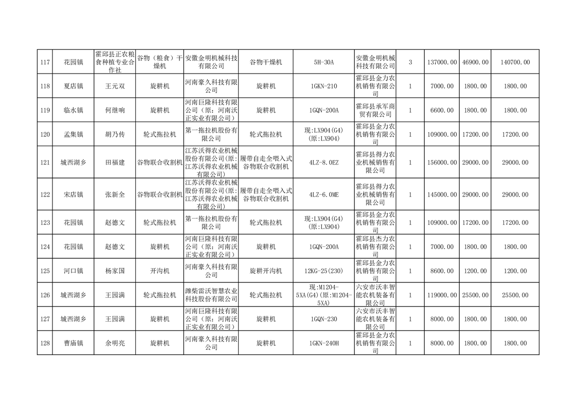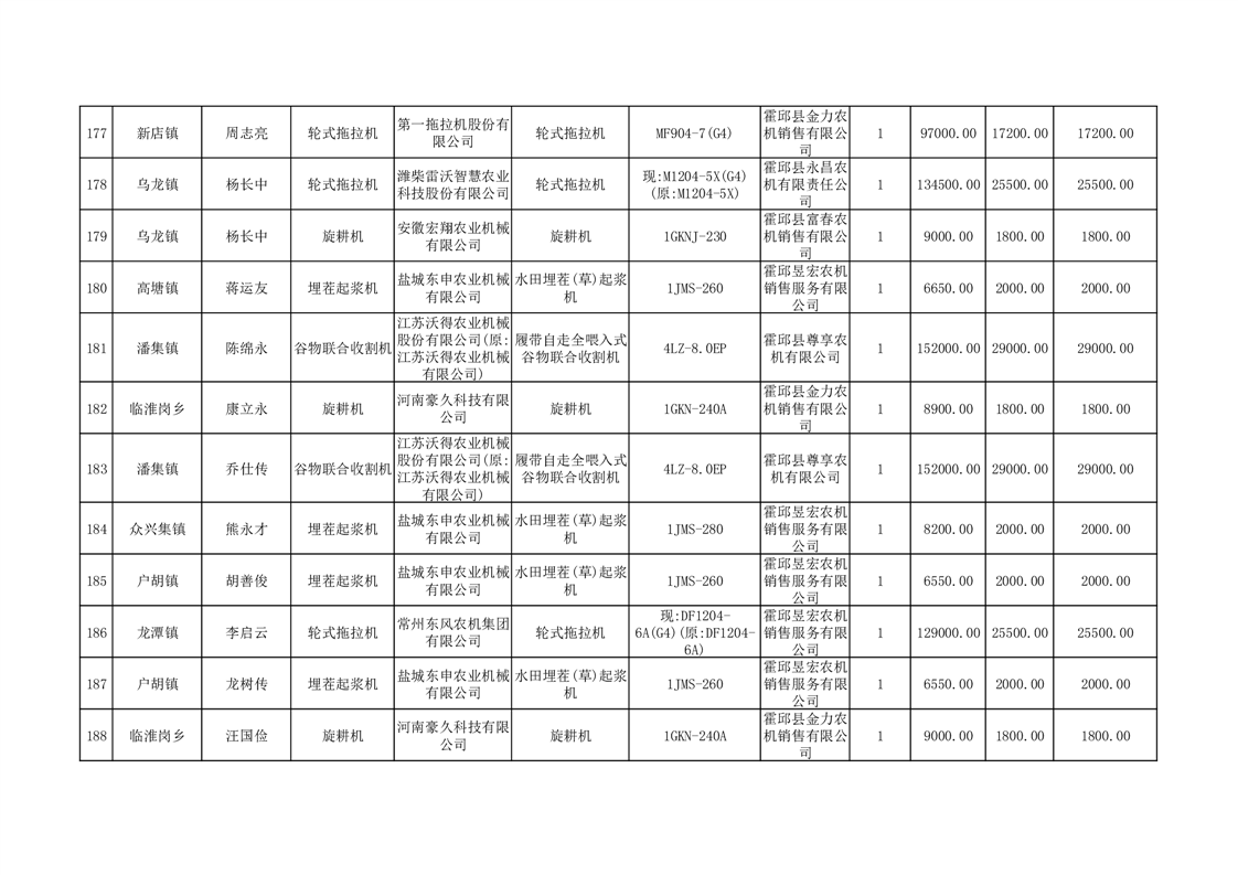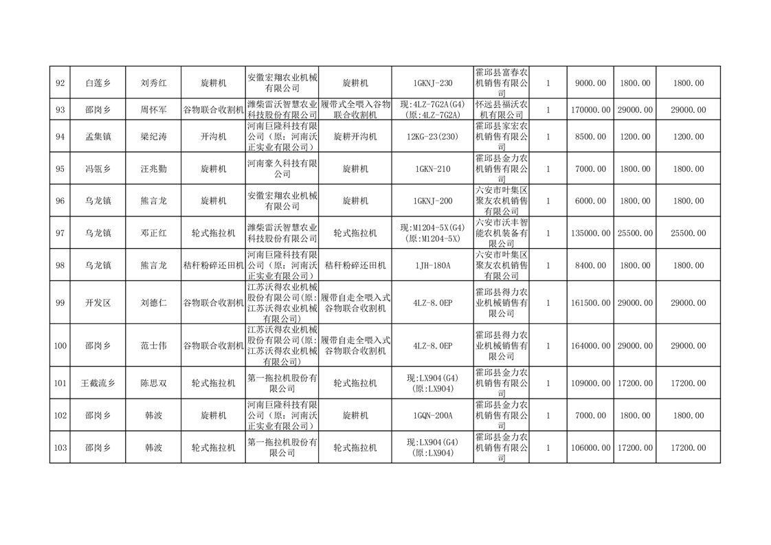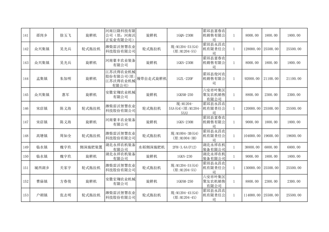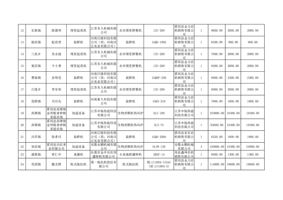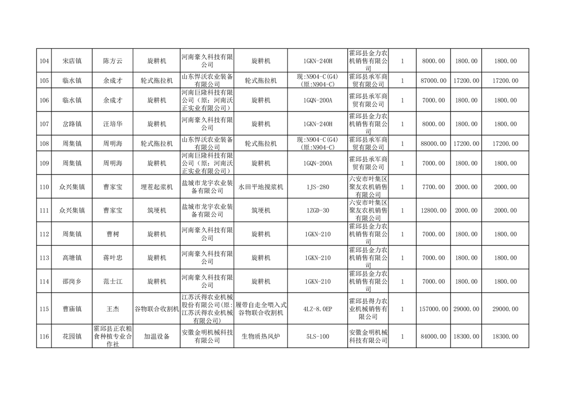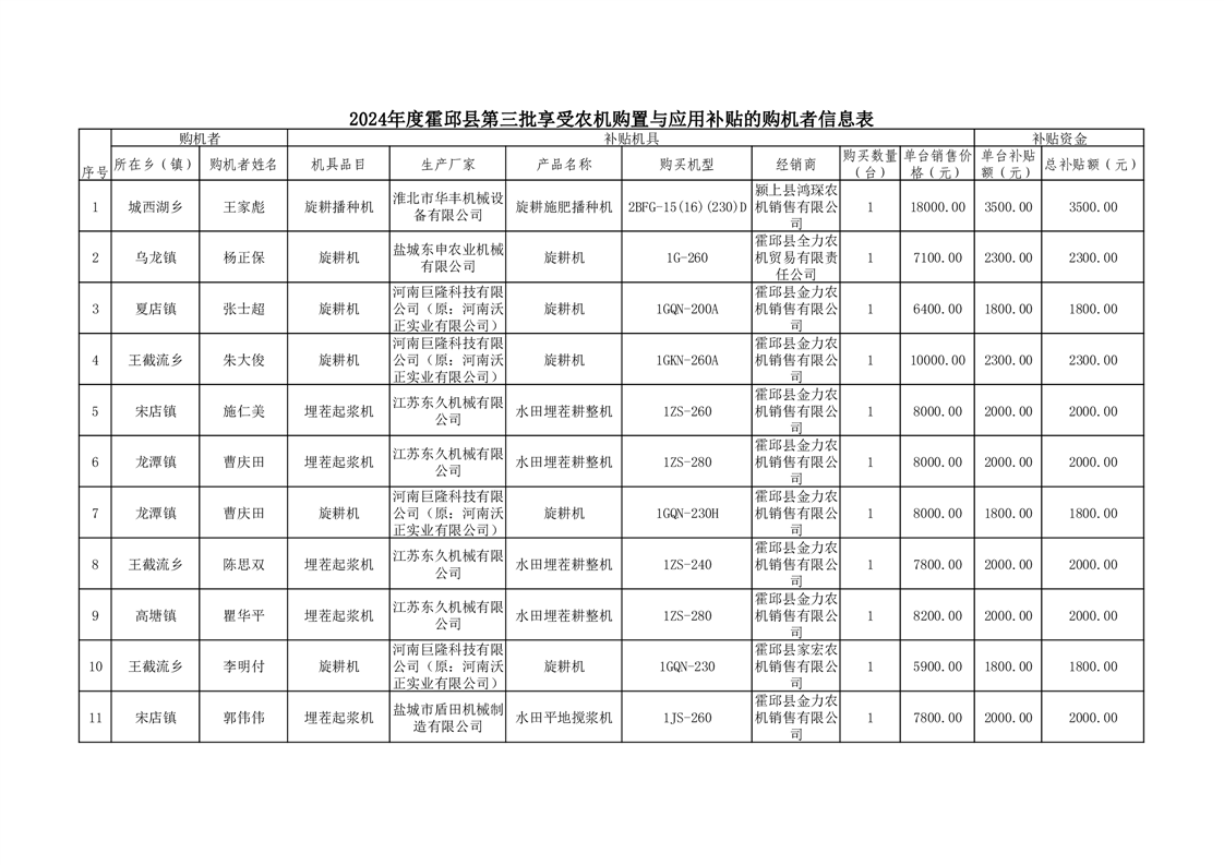 【补贴结果】霍邱县众兴集镇2024年第三批享受农机购置与应用补贴的购机者信息表