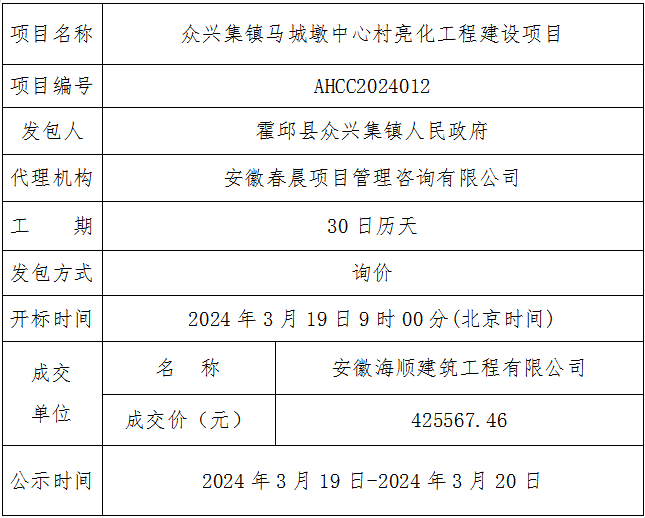 众兴集镇马城墩中心村亮化工程建设项目成交结果公示