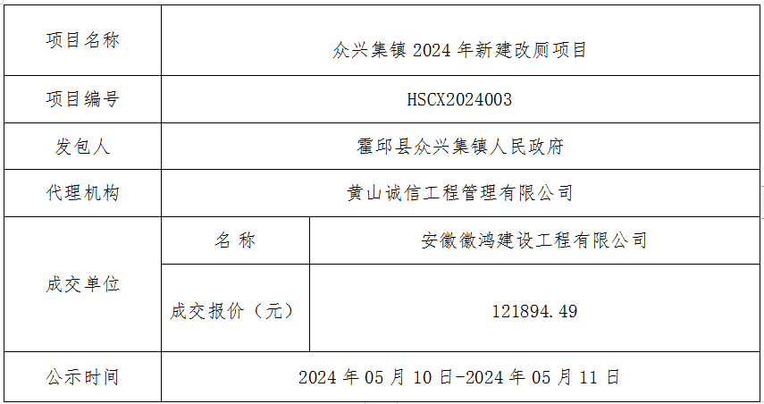 众兴集镇2024年新建改厕项目成交结果公示