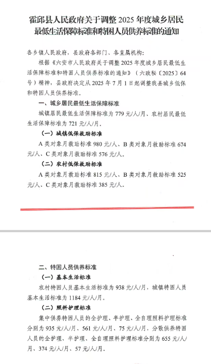 六安市特困人员救助供养标准