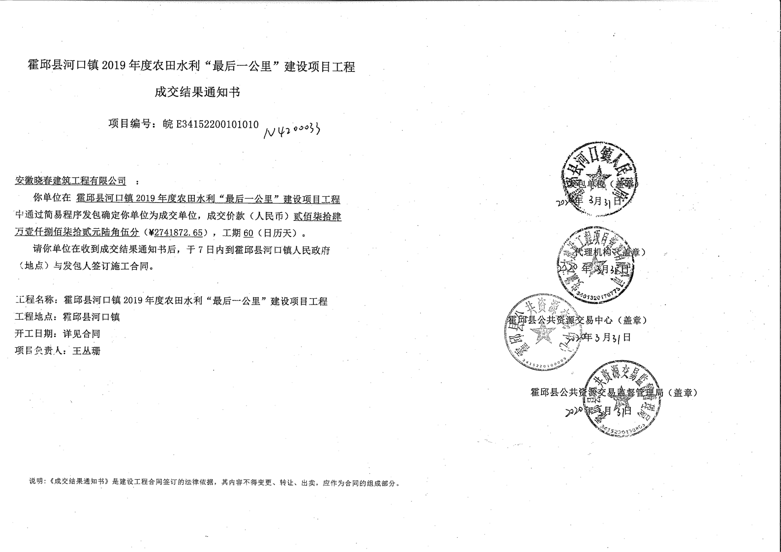 霍邱县河口镇2019年度农田水利“最后一公里“建设项目工程成交结果通知书