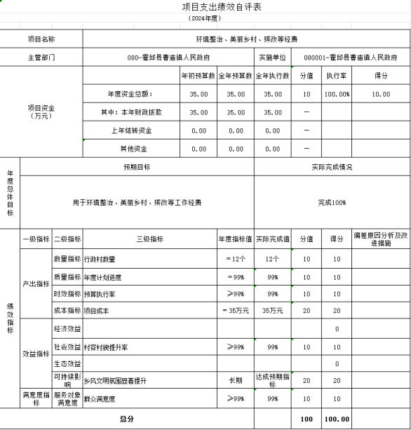 环境治理(生态环保)、美丽乡村建设、殡改等经费项目绩效自评综述:根据年初设定的绩效目标,项目绩效自评得分为100分。全年预算数为35万元,执行数为35万元,完成预算的100%。项目绩效目标完成情况:基本对本镇环境治理(生态环保)、美丽乡村建设、殡改等的补助的及时兑付,达到了预期目标。发现的主要问题及原因:一是预算分类和实际支出存在差异;二是编制的功能分类不够细化。下一步改进措施:一是强化预算管理意识, 加强预算管理;二是完善各类支出管理制度,细化收支项目。