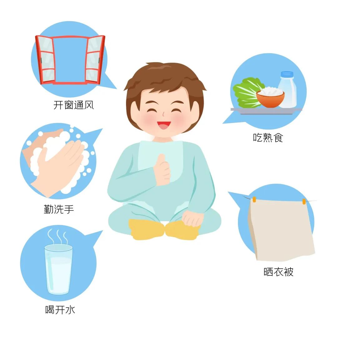 1.勤洗手:注意手部卫生,养成勤洗手的习惯;饭前便后、外出后使用肥皂或洗手液洗手。