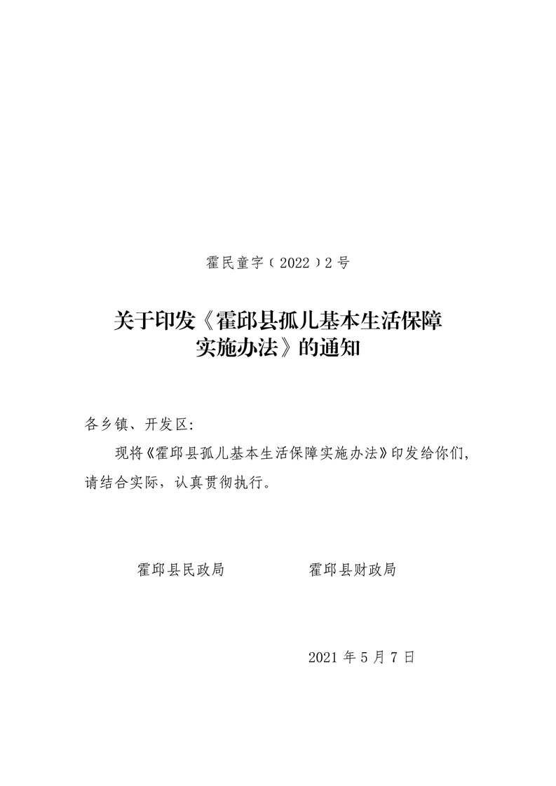关于印发《霍邱县孤儿基本生活保障实施办法》的通知