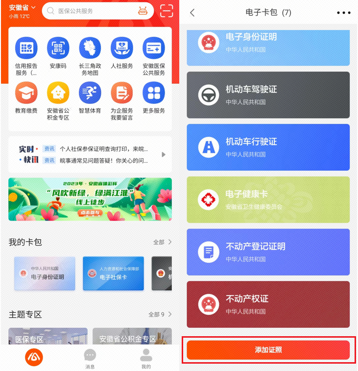 下载“皖事通”APP,注册并登录。在首页找到“我的卡包”(部分市可以在搜索框中搜索“电子卡包”),点击进入后点击“添加证照”。