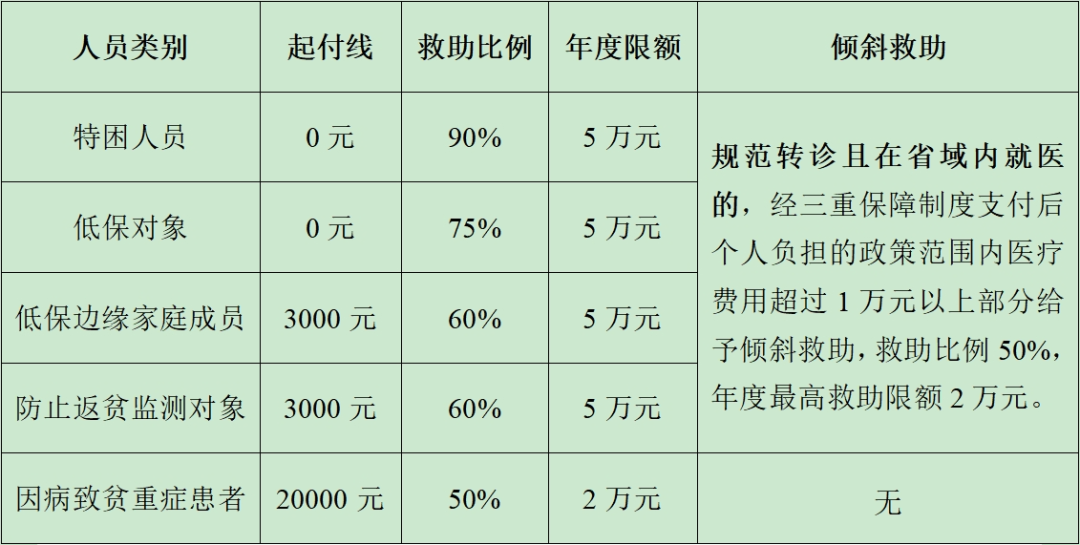 4.救助对象的大病保险是如何规定的? 答:大病保险对特困人员、低保对象和返贫致贫人口实施倾斜支付,较普通参保人员起付标准降低50%、报销比例提高5个百分点、取消封顶线。