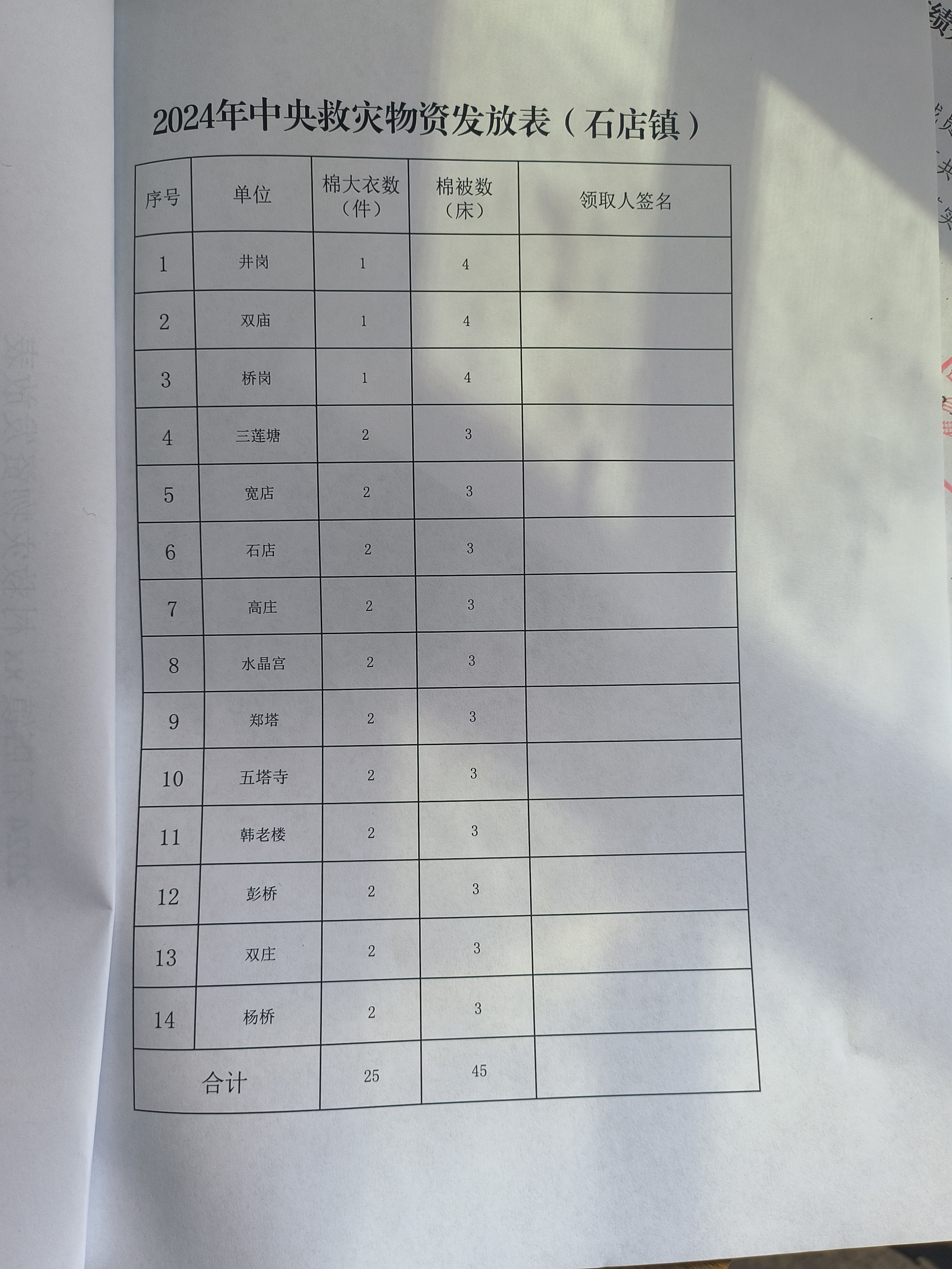 截至目前,我镇2024年2月遭遇大雪灾害,目前上级暂未下发救助资金,因此无大雪灾害救助资金发放情况;应急局下拨我镇45床棉被,25件棉大衣,各村分配如下: