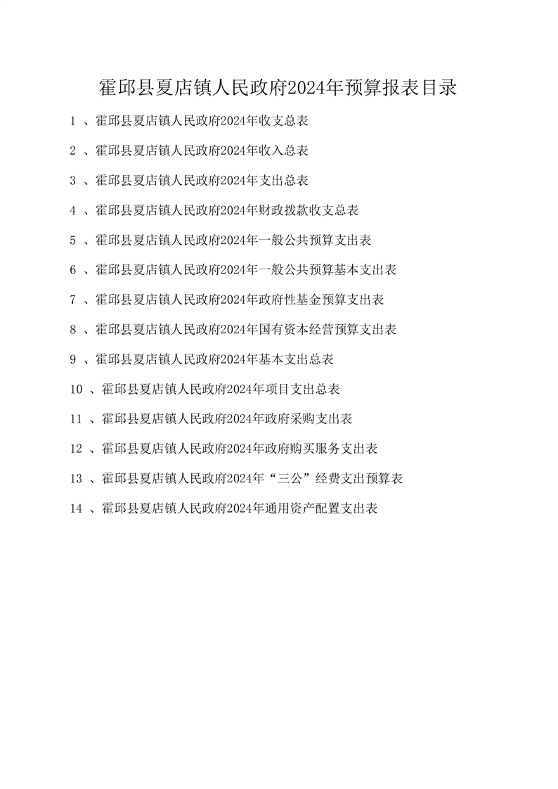 夏店镇人民政府2024年预算表由以下14张表格构成,具体表格内容见附件。