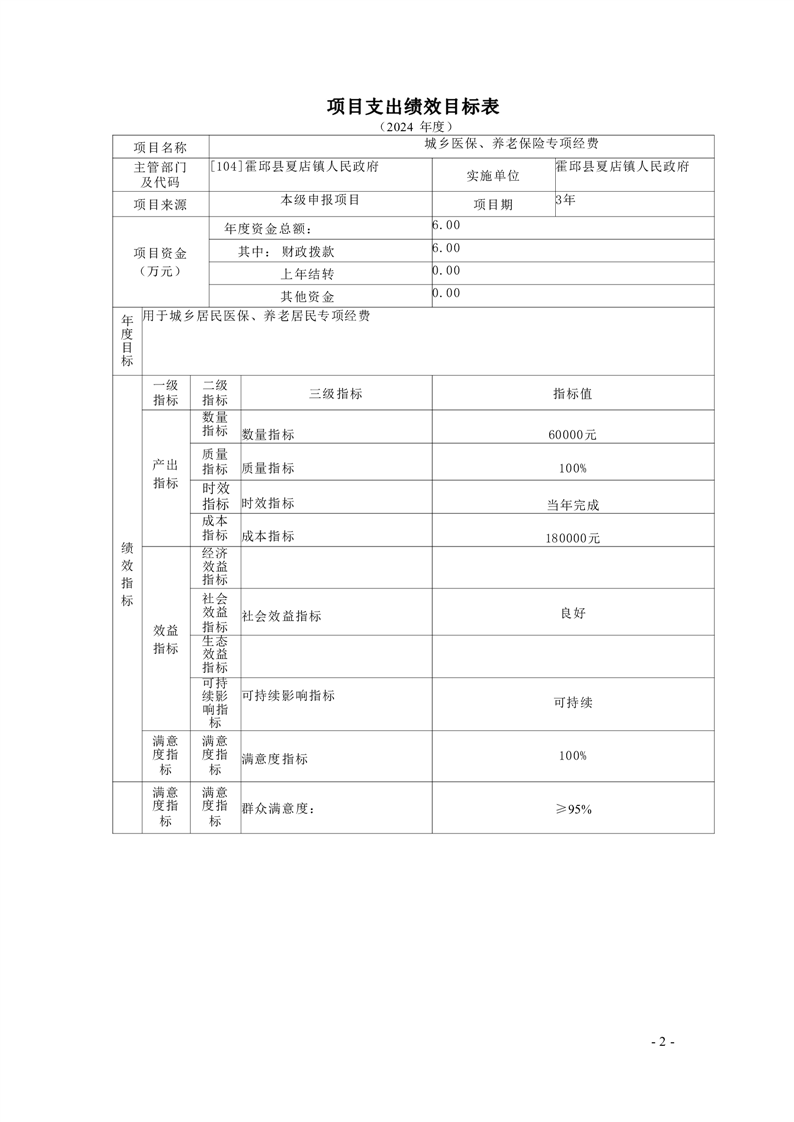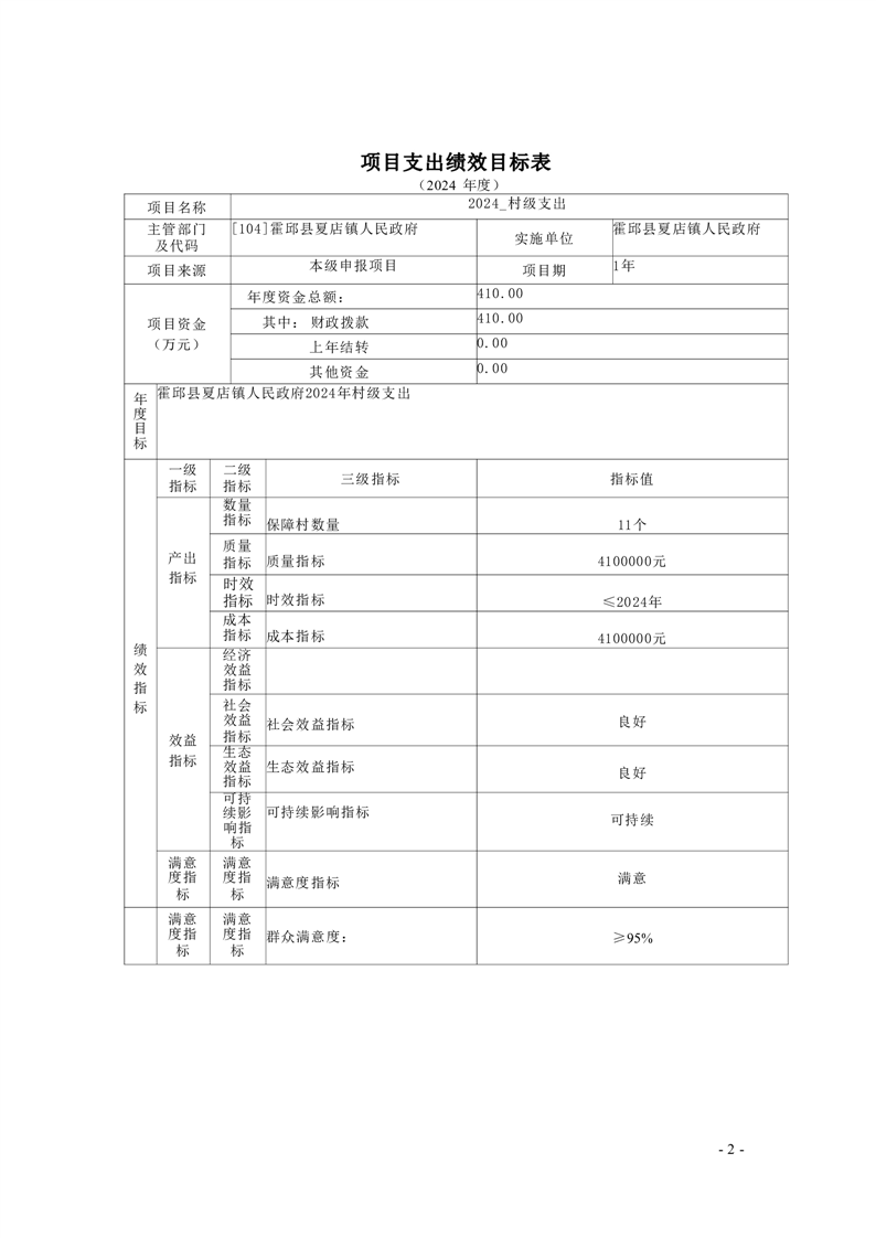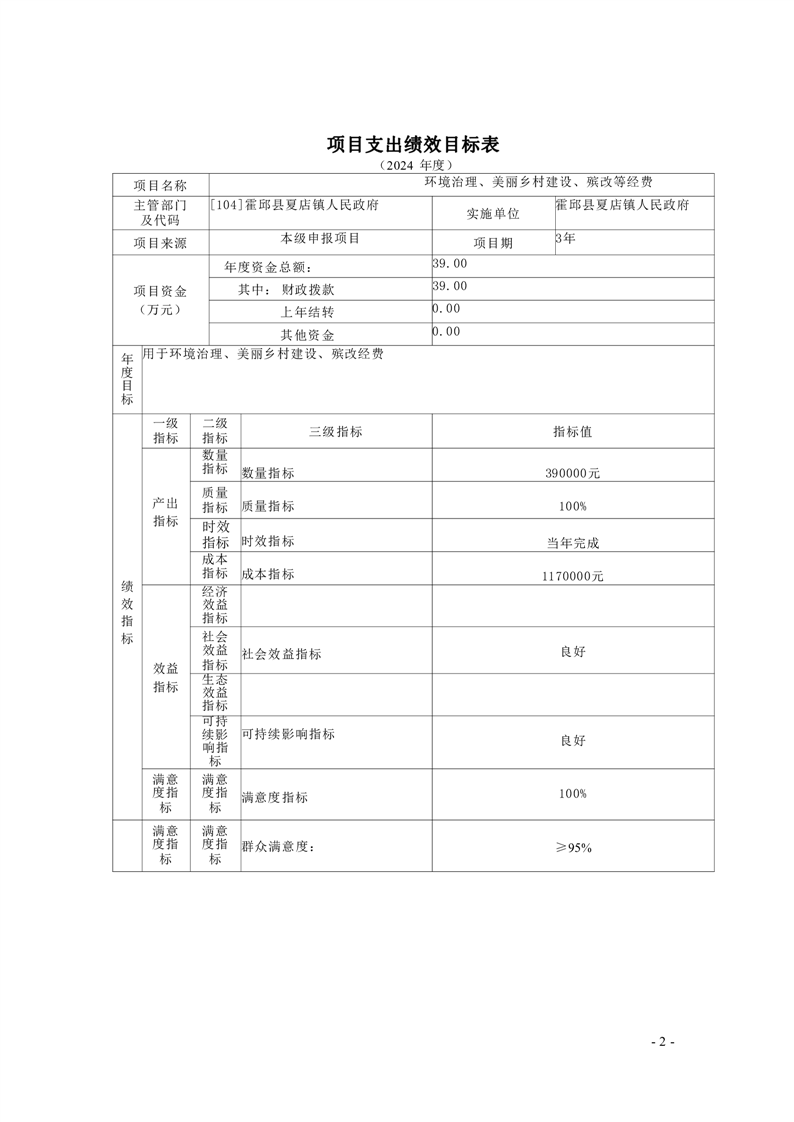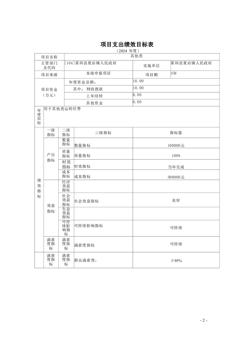 2024年霍邱县夏店镇人民政府编制项目绩效目标8个,预算资金805万元。绩效目标包括总体目标和绩效指标,总体目标是项目预期产出和效益的总体描述,绩效指标是总体目标的细化和量化。绩效指标统一按照三级设置,一级指标分为产出指标、效益指标两大类,二级指标分为数量指标、质量指标、时效指标、成本指标(均属于产出指标)和经济效益、社会效益、生态效益、可持续影响指标、满意度指标(均属于效益指标),三级指标结合项目实际,明确具体指标和指标值。
