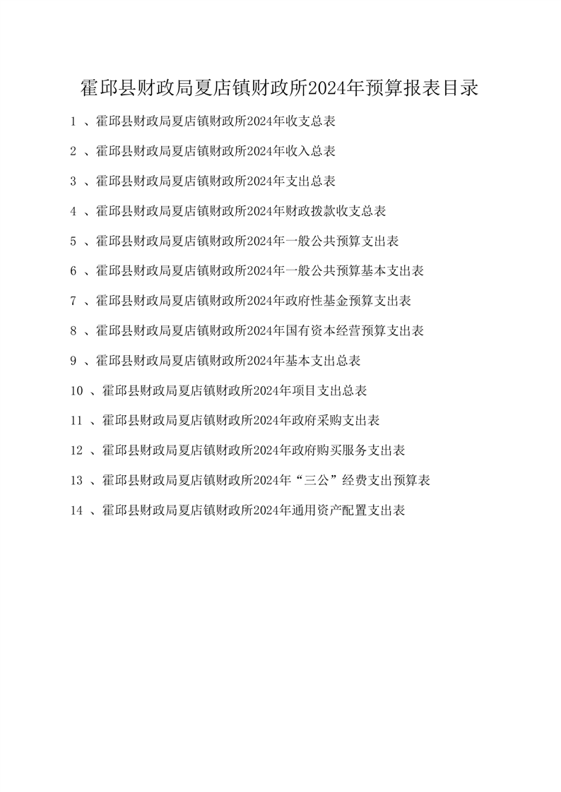 霍邱县财政局夏店镇财政所2024年预算表由以下14张表格构成,具体表格内容见附件。