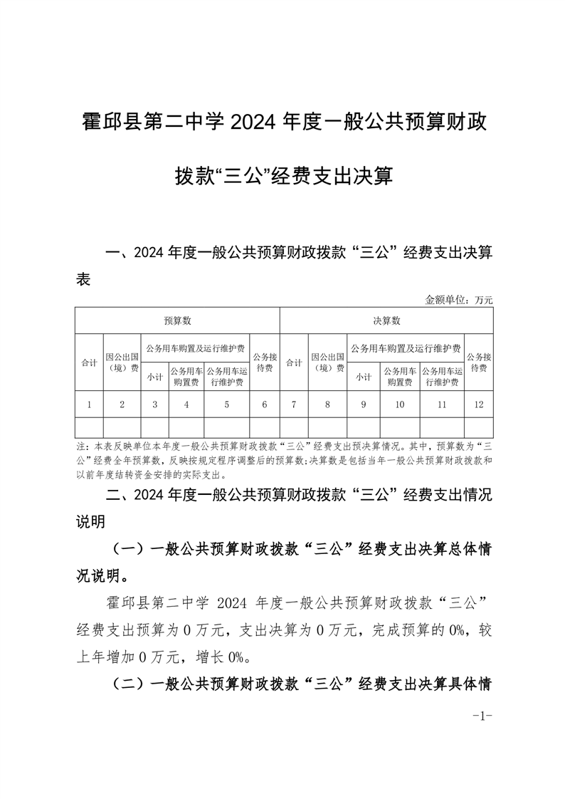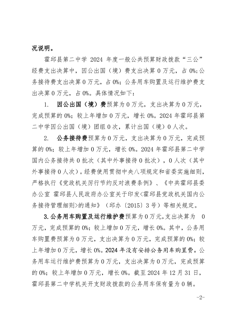 霍邱县第二中学 2024 年度一般公共预算财政拨款“三公”经费支出决算公开