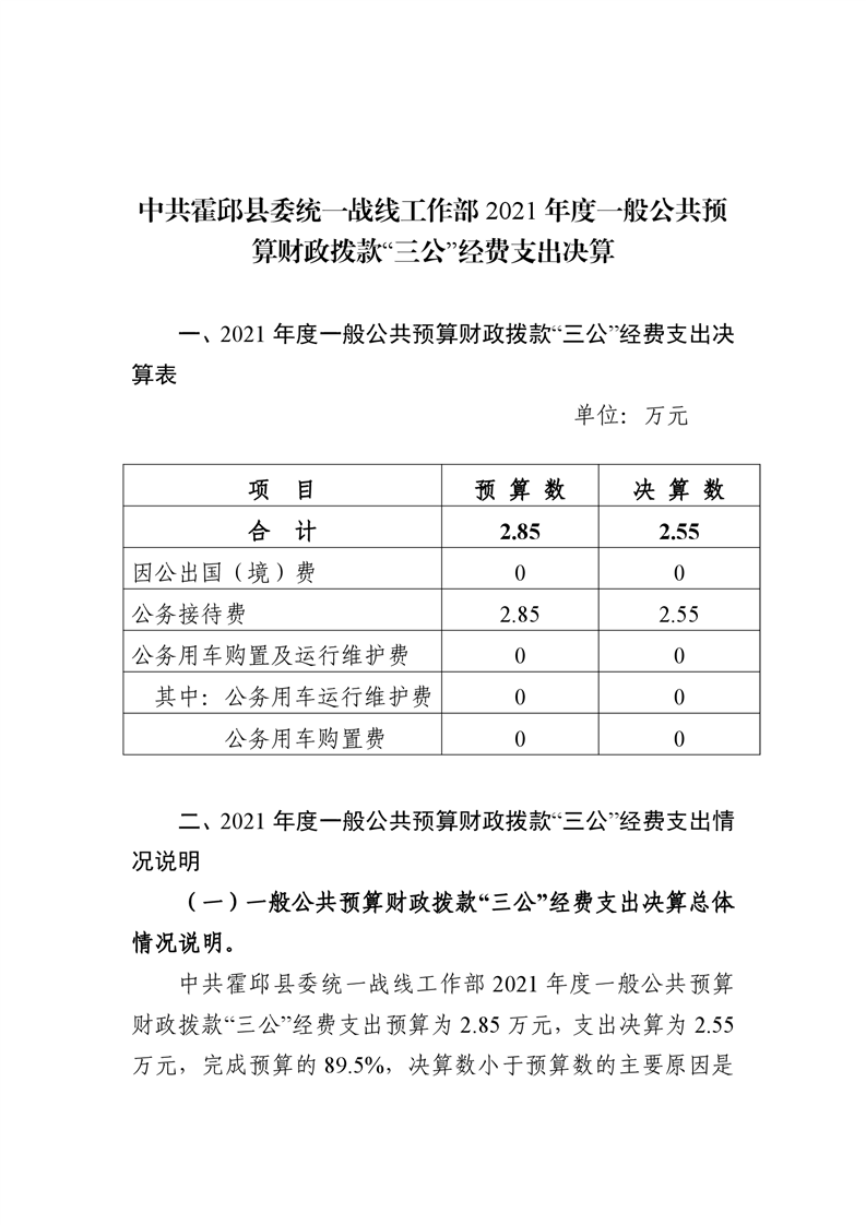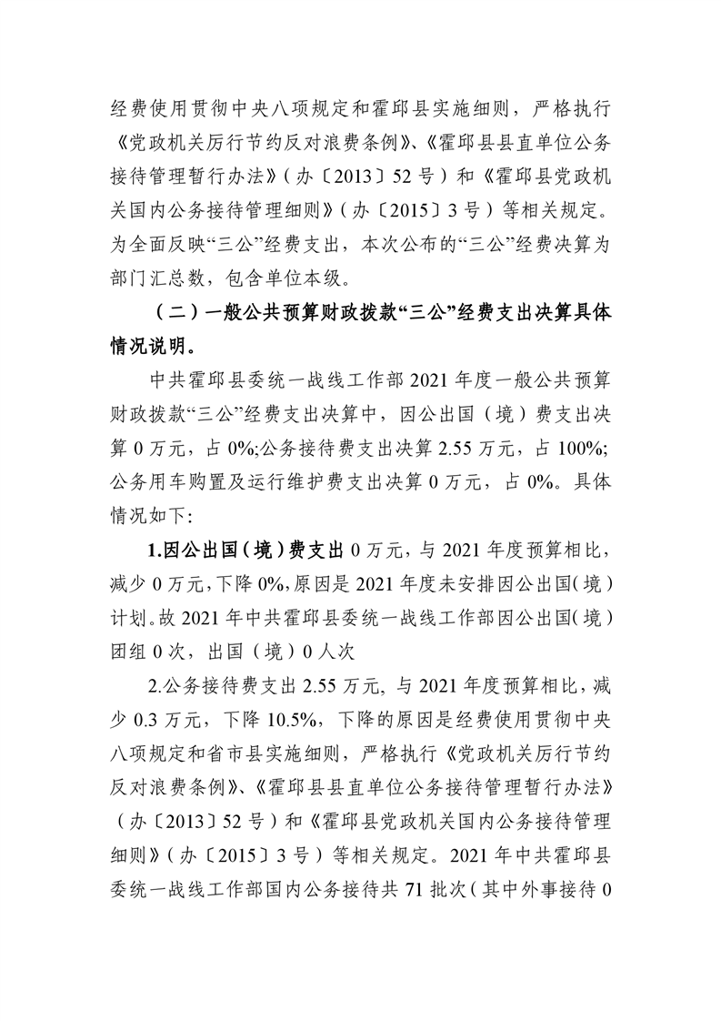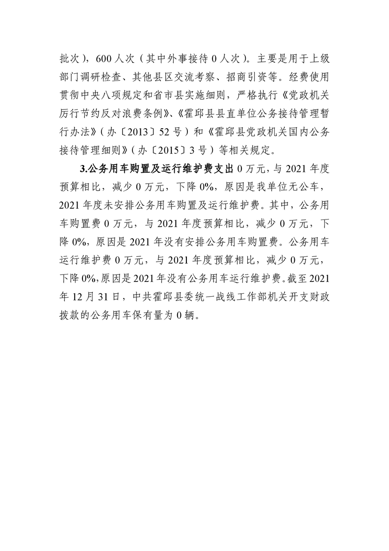 中共霍邱县委统一战线工作部2021年度一般公共预算财政拨款“三公”经费支出决算
