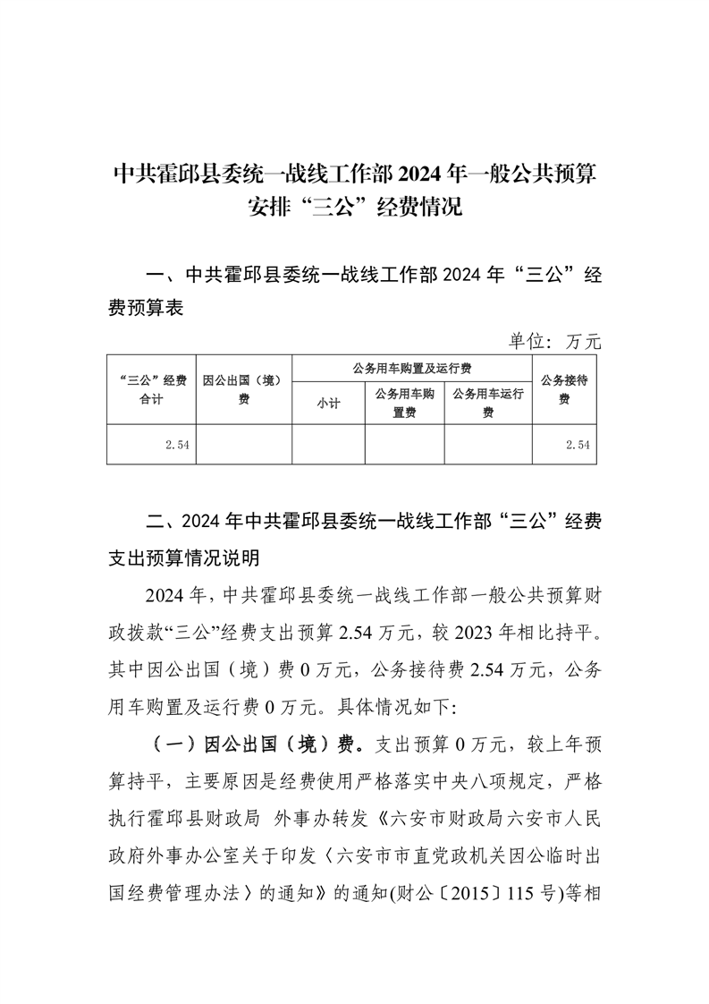 中共霍邱县委统一战线工作部2024年一般公共预算安排“三公”经费情况