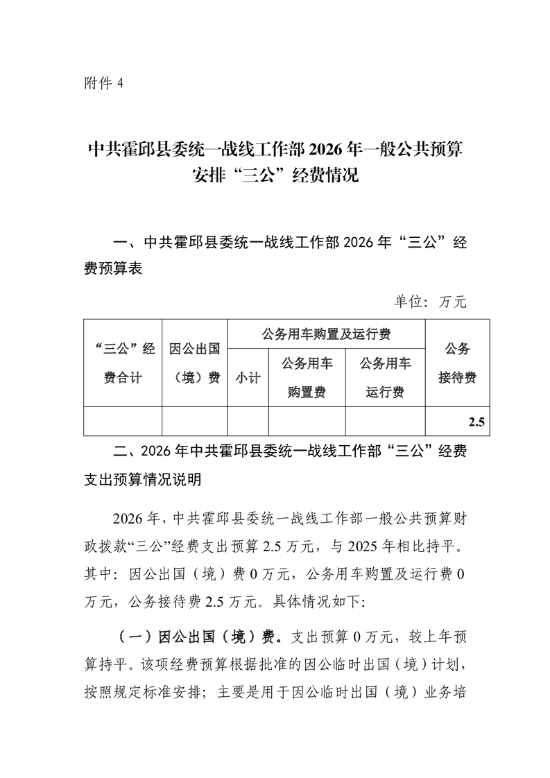 中共霍邱县委统一战线工作部2026年度一般公共预算安排“三公”经费情况