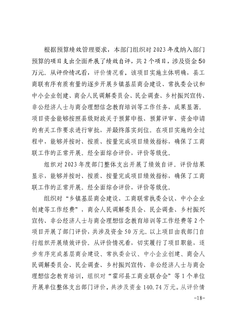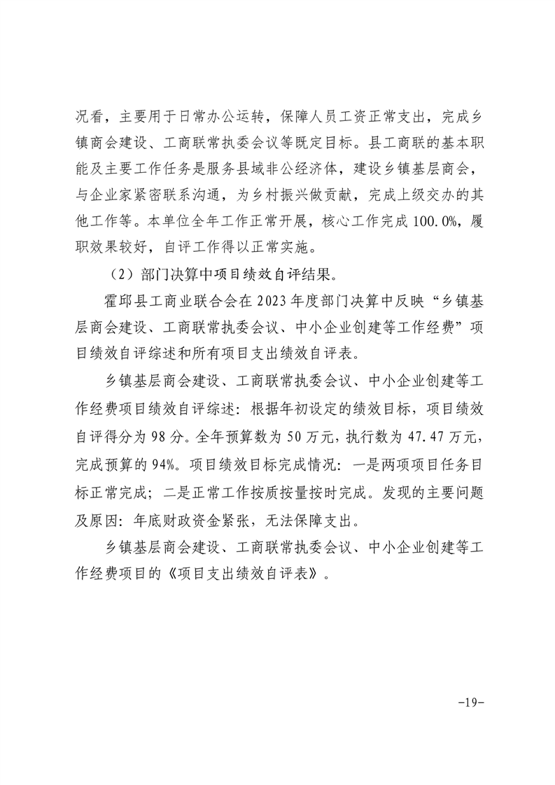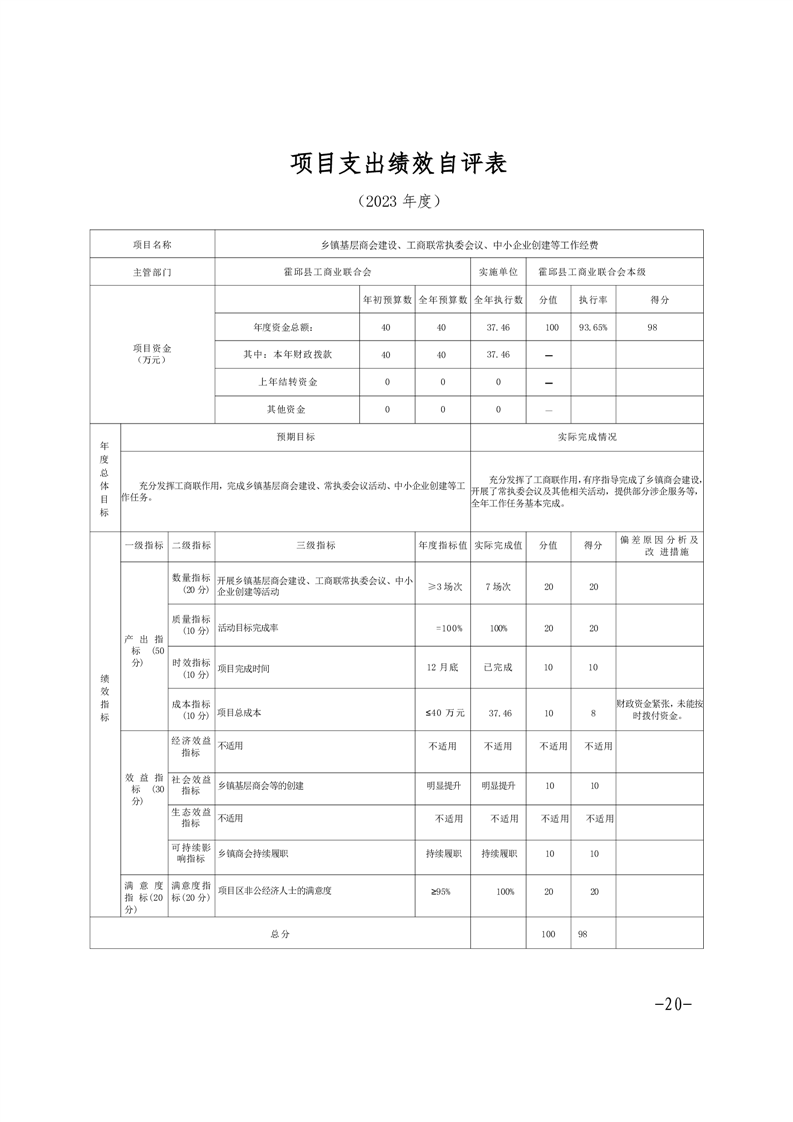 霍邱县工商业联合会2023年度项目支出绩效自评表及2022年度乡镇基层商会建设、工商联常执委会议、中小企业创建等工作经费项目绩效评价报告.pdf