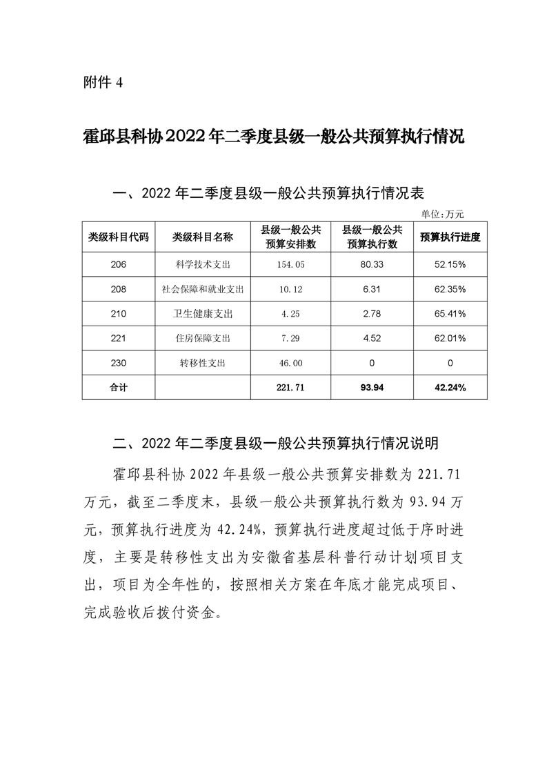 霍邱县科协2022年二季度县级一般公共预算执行情况