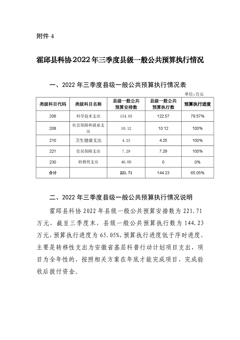 霍邱县科协2022年三季度县级一般公共预算执行情况