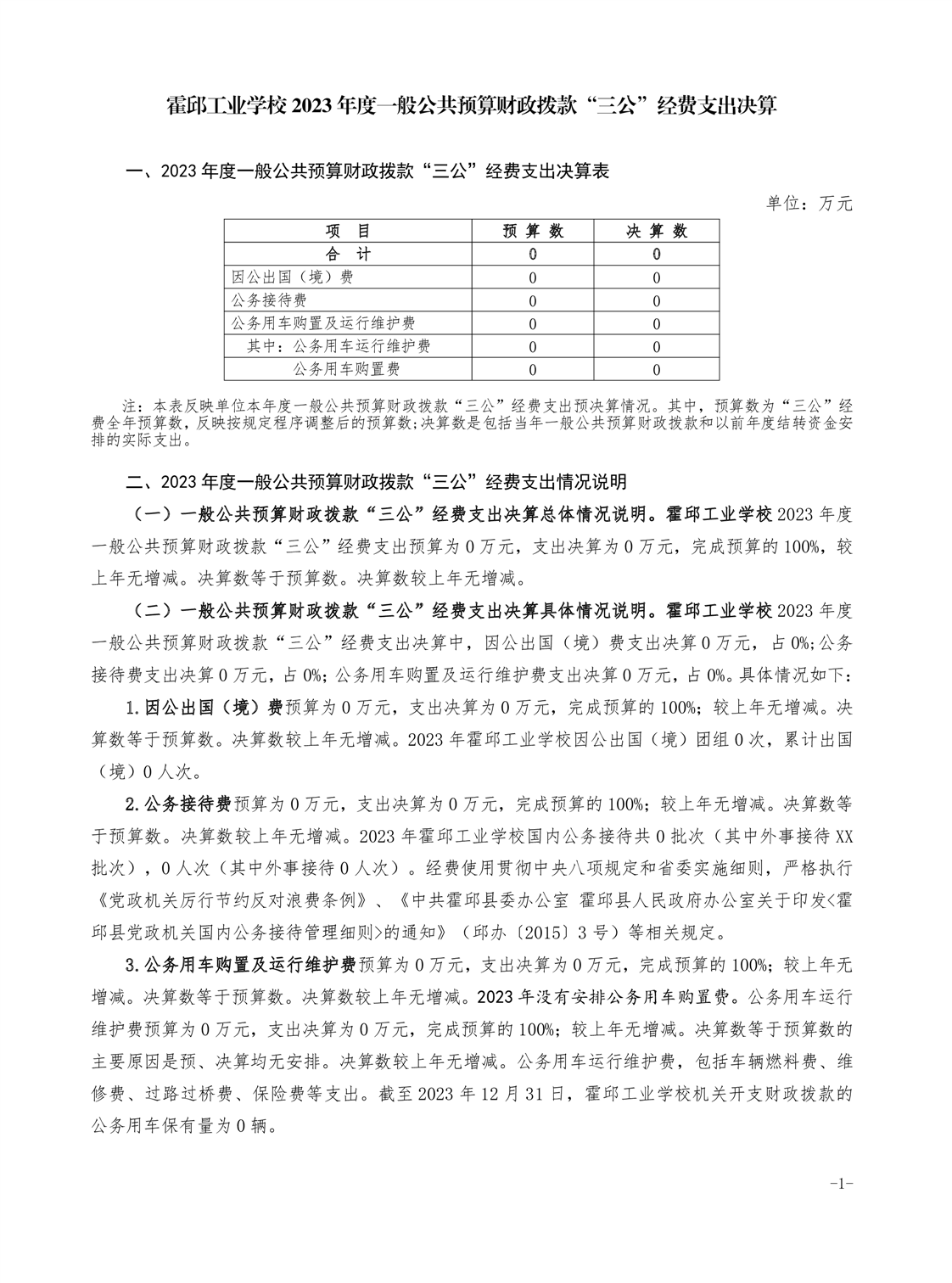 霍邱工业学校2023 年度一般公共预算财政拨款“三公” 经费支出决算
