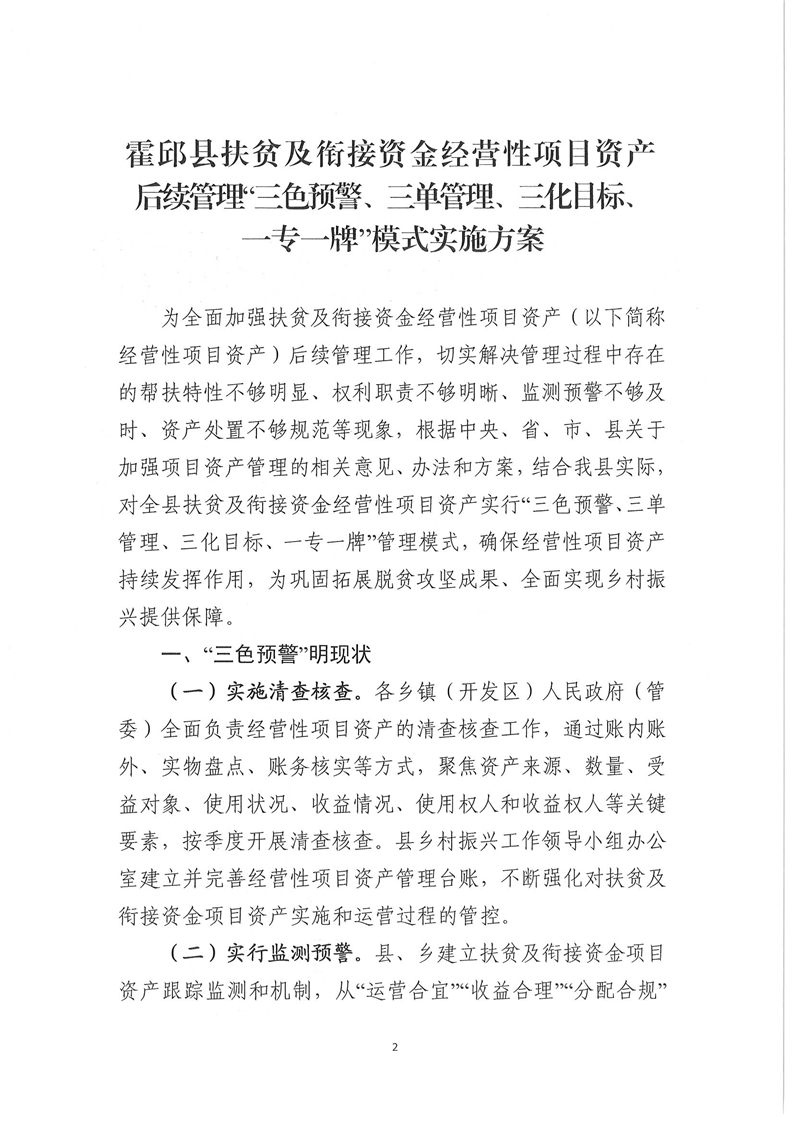 | 名 称: | 【县级政策】霍邱县扶贫及衔接资金经营性项目资产后续管理“三色预警、三单管理、三化目标、一专一牌”模式实施方案 |