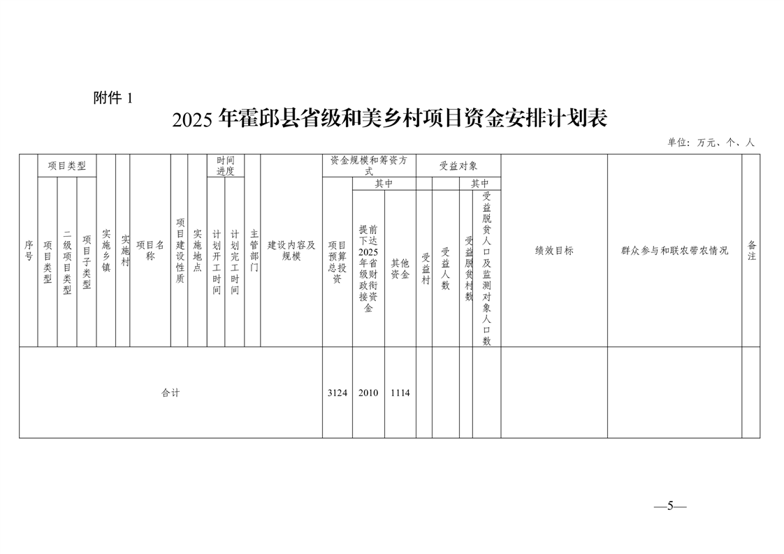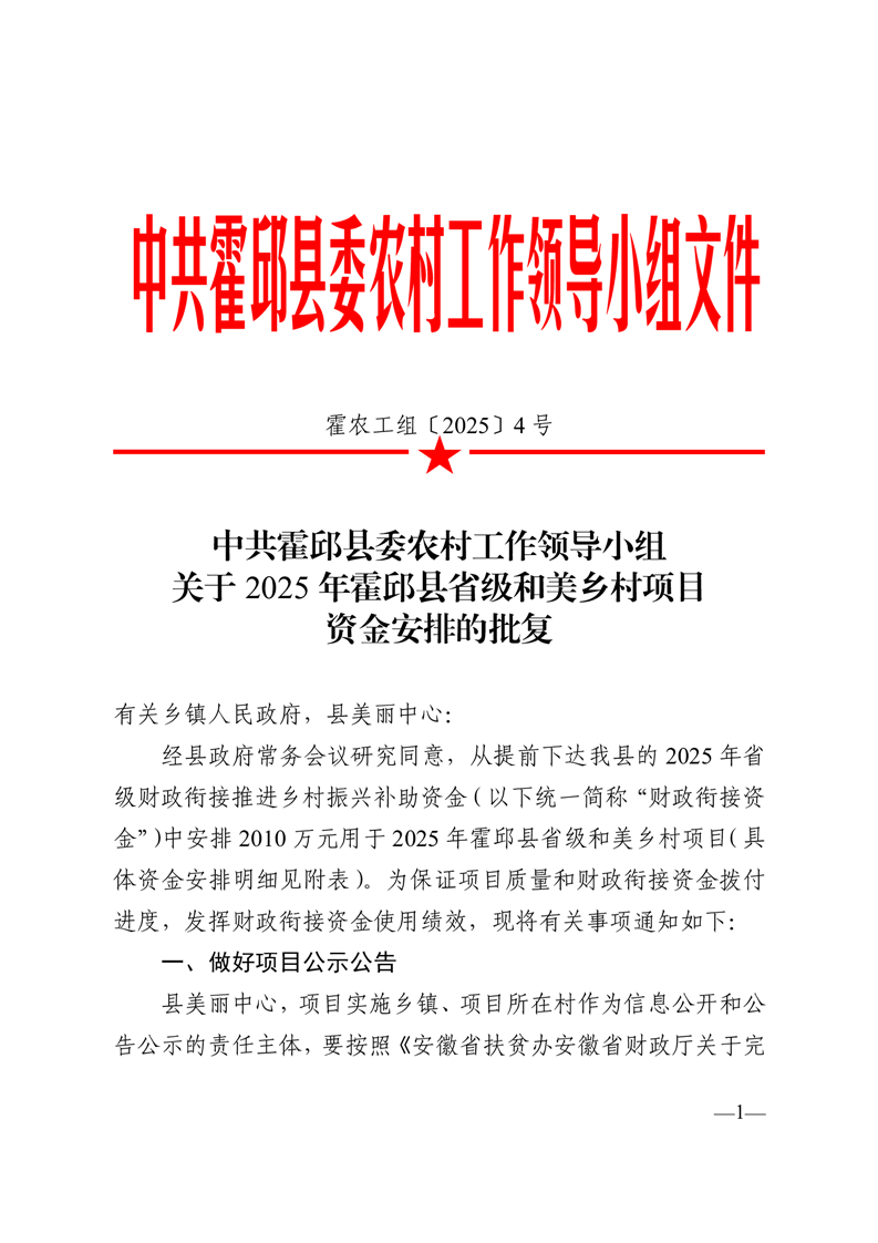 | 名 称: | 【计划安排情况】关于2025年霍邱县省级和美乡村项目资金安排的批复 |
