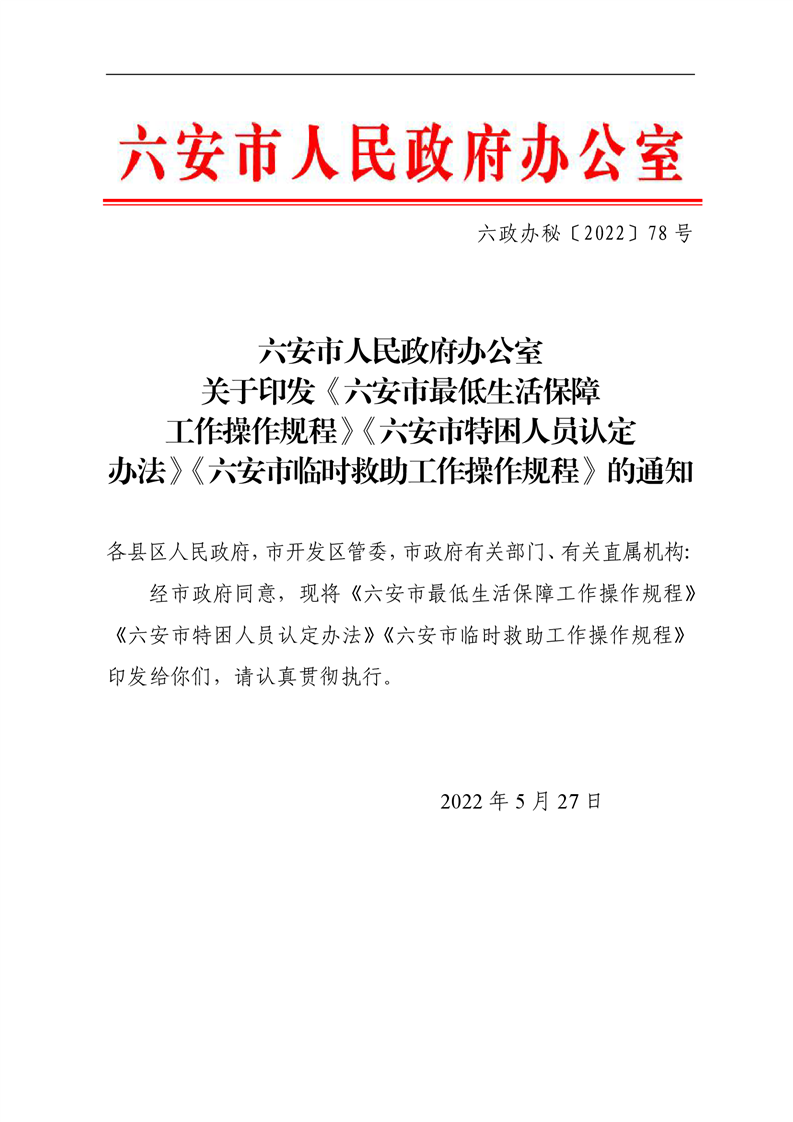 | 名 称: | 【有效】六安市人民政府办公室关于印发《六安市最低生活保障工作操作规程》《六安市特困人员认定办法》《六安市临时救助工作操作规程》的通知 |