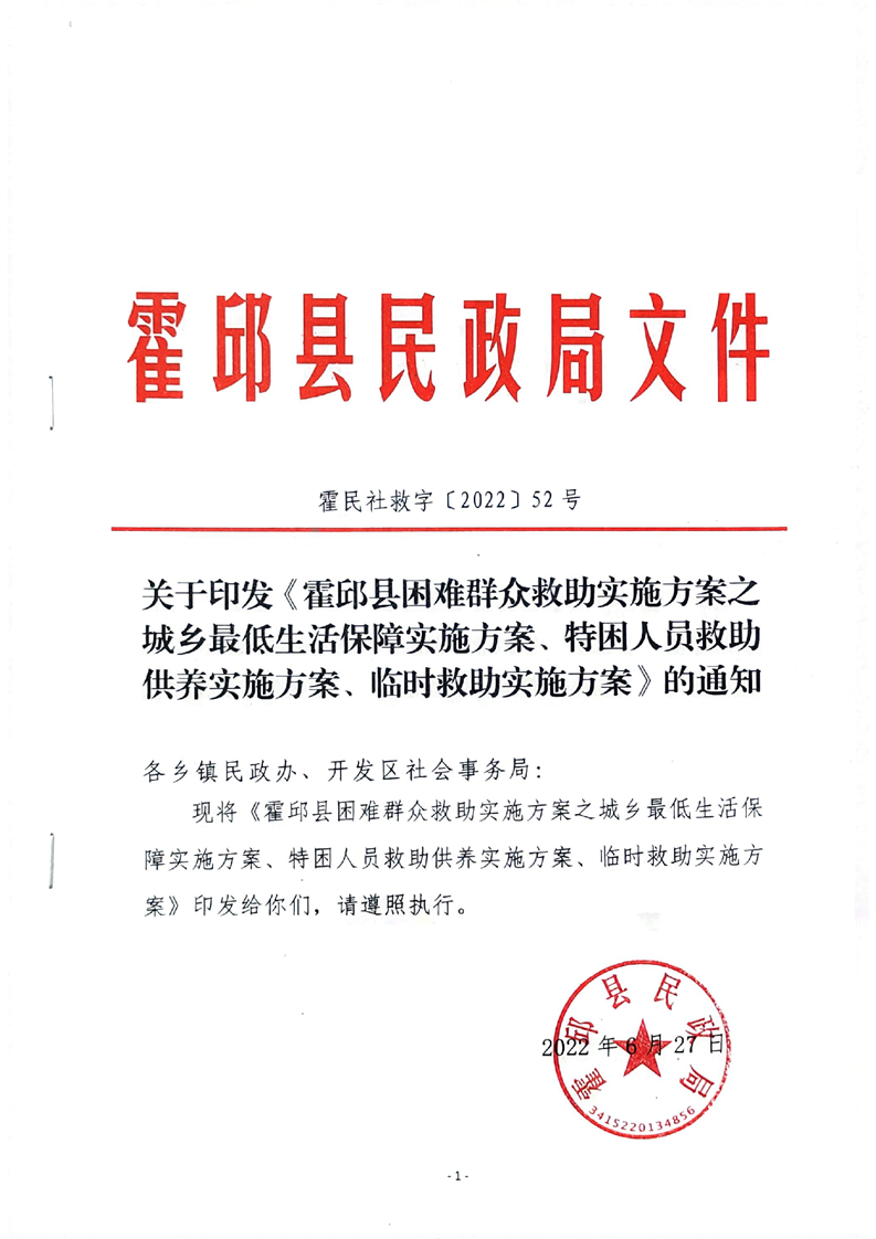 | 名 称: | 【县级】关于印发《霍邱县困难群众救助实施方案之城乡最低生活保障实施方案、特困人员救助供养实施方案、临时救助实施方案》的通知 | ||