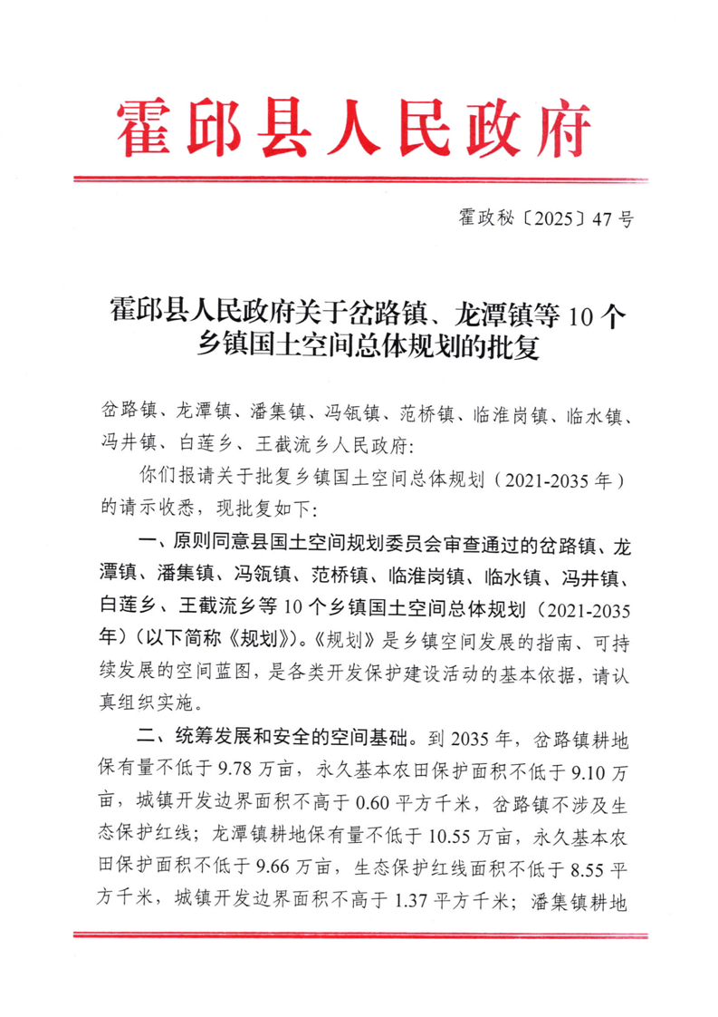 | 名 称: | 【批准文件】霍邱县人民政府关于岔路镇、龙潭镇等10个乡镇国土空间总体规划的批复 |