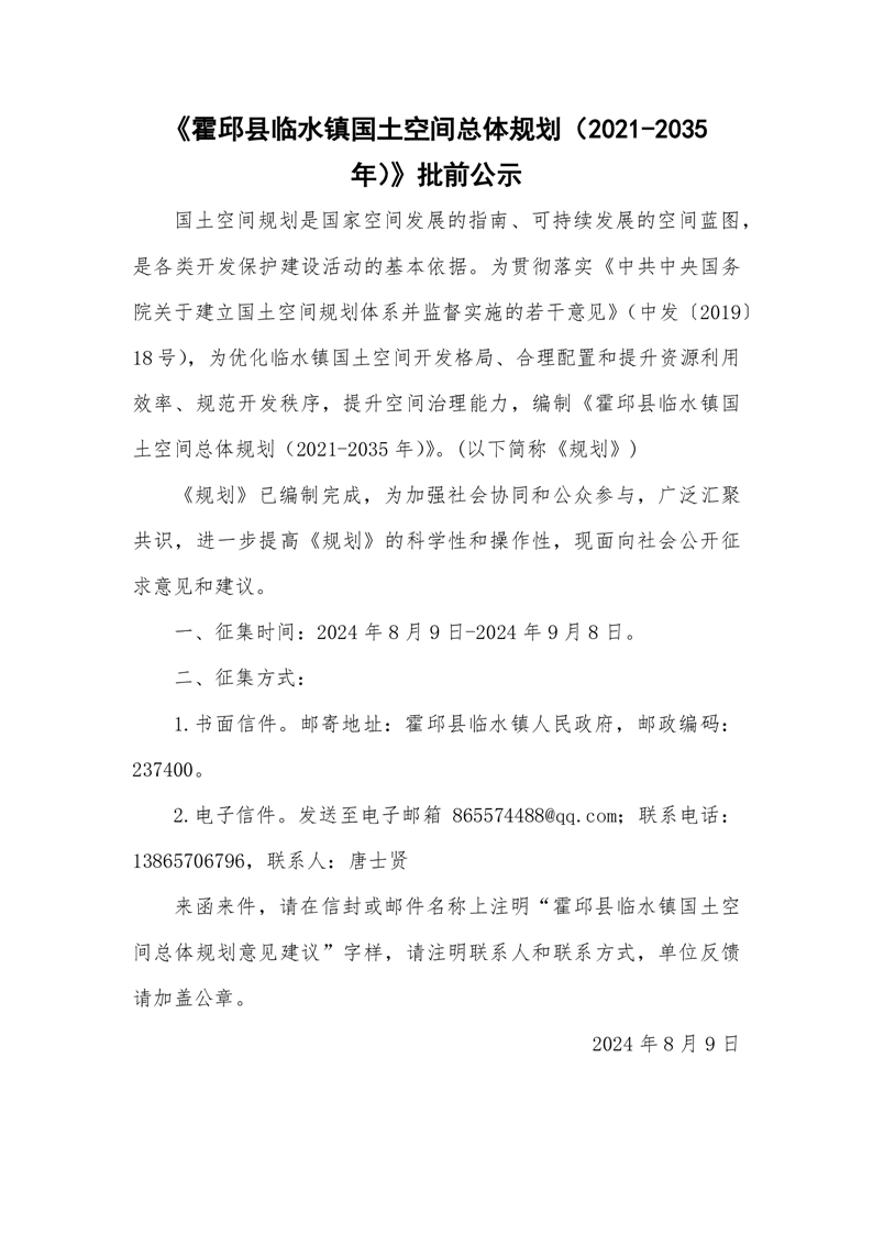 | 名 称: | 【批前公示】霍邱县临水镇国土空间总体规划(2021-2035年)批前公示 |