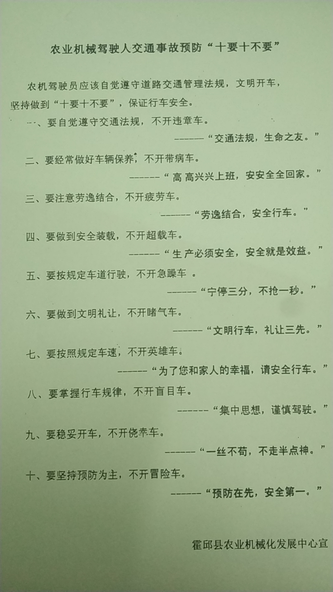 | 名 称: | 农业机械驾驶人交通事故预防“十要十不要” |
