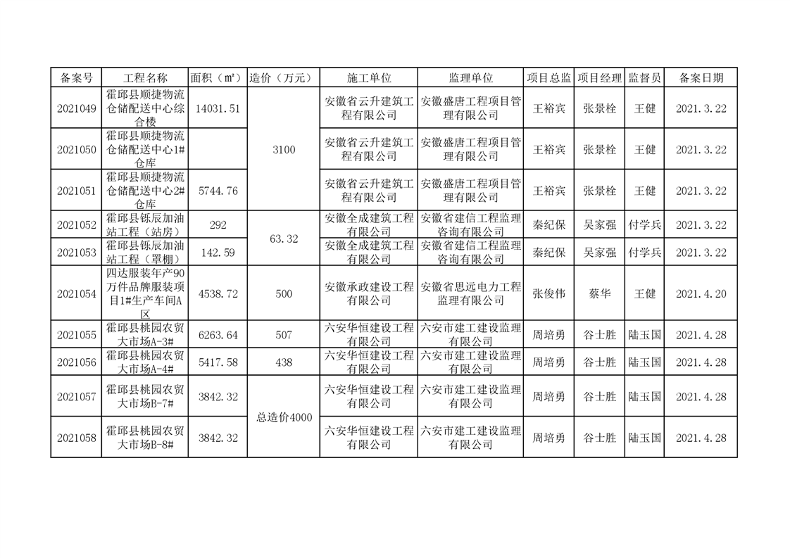 2021年建设工程竣工验收备案一览表(3-4月)