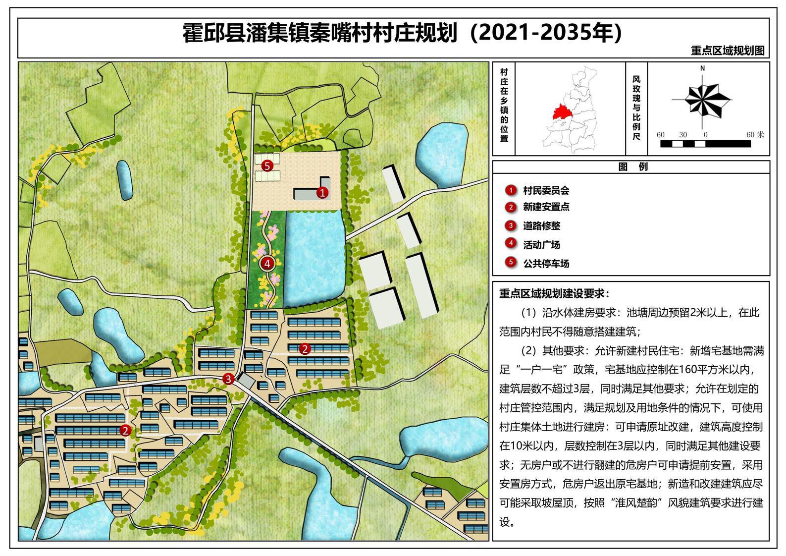 1.规划目标:明确秦嘴村集聚提升类的发展定位,以提升村庄人居环境与村民收入为第一目标,稳一产、促二产、推三产,基于村庄区位、现状产业基础,梳理关键要素,整合优势资源,依托丰富的水资源本底和农业资源,打造农业观光示范村。依托秦嘴村优质的沿湖生态资源,将农业观光产业与特色种植有机结合在一起,打造临湖休闲观光片区。