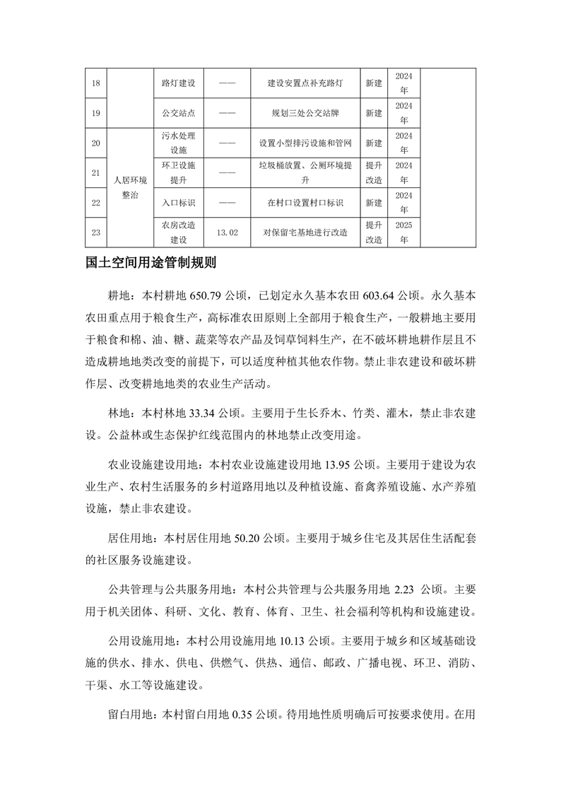 2.国土空间开发与保护:至规划期末,周岗村耕地保有量650.79公顷,永久基本农田保护面积603.64公顷。建设用地规模87.80公顷(其中村庄建设用地规模54.62公顷,区域基础设施用地规模30.99公顷、其他建设用地2.18公顷)。人均建设用地规模不超过164平方米/人(新建居民点不超过150平方米/人),新建住宅户均宅基地面积不超过160平方米/户。