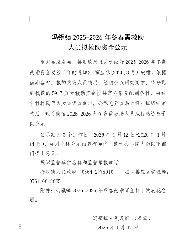 冯瓴镇2025-2026年冬春需救助人员拟救助资金公示