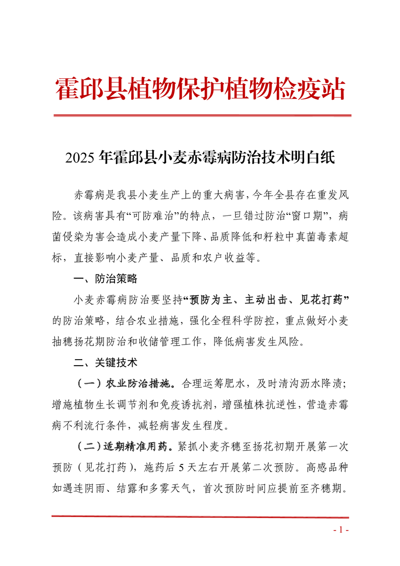 | 名 称: | 【农业防灾抗灾政策宣传】2025年霍邱县小麦赤霉病防治技术明白纸 |