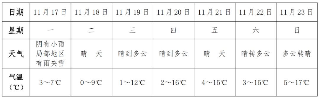 受较强冷空气影响,今天全县气温持续降低,明天凌晨最低气温将降至0℃;19 日起气温逐渐回升,本周中后期最低气温维持在3~5℃,周日最高气温将升至 17℃。寒意渐浓,请注意添衣保暖,谨防感冒。