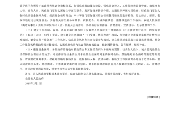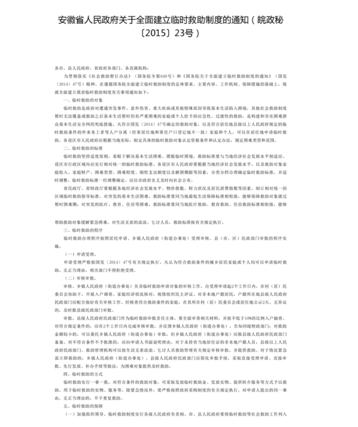 | 名 称: | 《安徽省人民政府关于全面建立临时救助制度的通知》(皖政秘〔2015〕23号) |