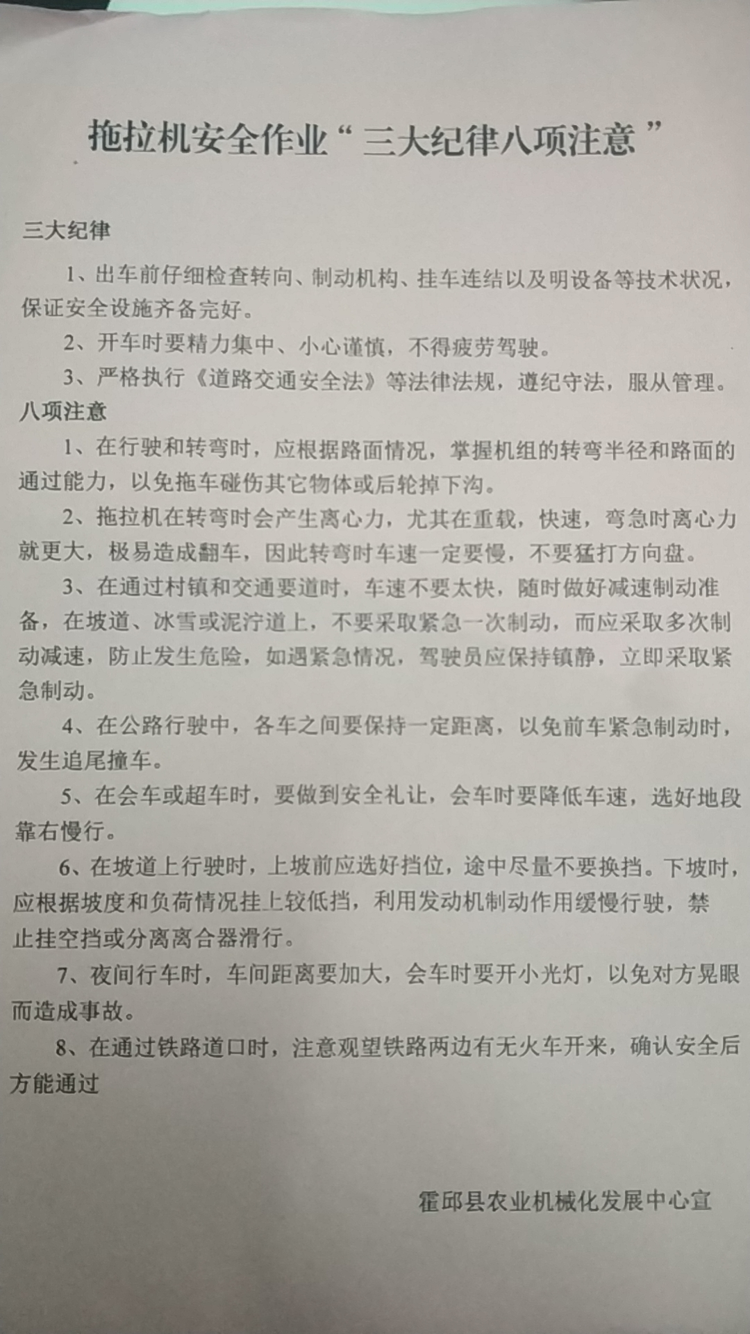 | 名 称: | 拖拉机安全作业“三大纪律八项注意” |