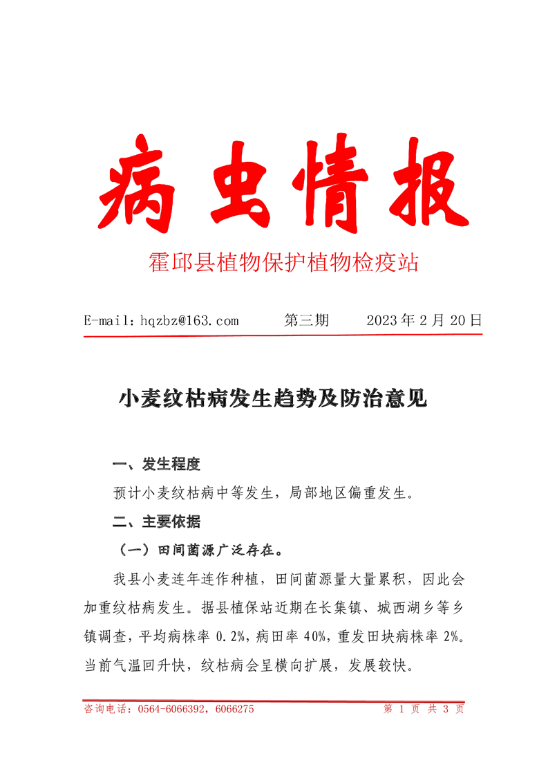 | 名 称: | 小麦纹枯病发生趋势及防治意见 |